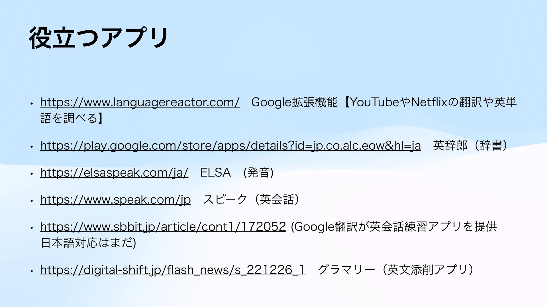 IUUQTFMTBTQFBLDPNKBɹ&-4"ɹ ൃԻ w IUUQTXXXTQFBLDPNKQɹεϐʔΫʢӳձʣ w IUUQTXXXTCCJUKQBSUJDMFDPOU (PPHMF༁͕ӳձ࿅शΞϓϦΛఏڙɹ ຊޠରԠ·ͩ w IUUQTEJHJUBMTIJGUKQ fl BTI@OFXTT@@ɹάϥϚϦʔʢӳจఴΞϓϦʣɹ