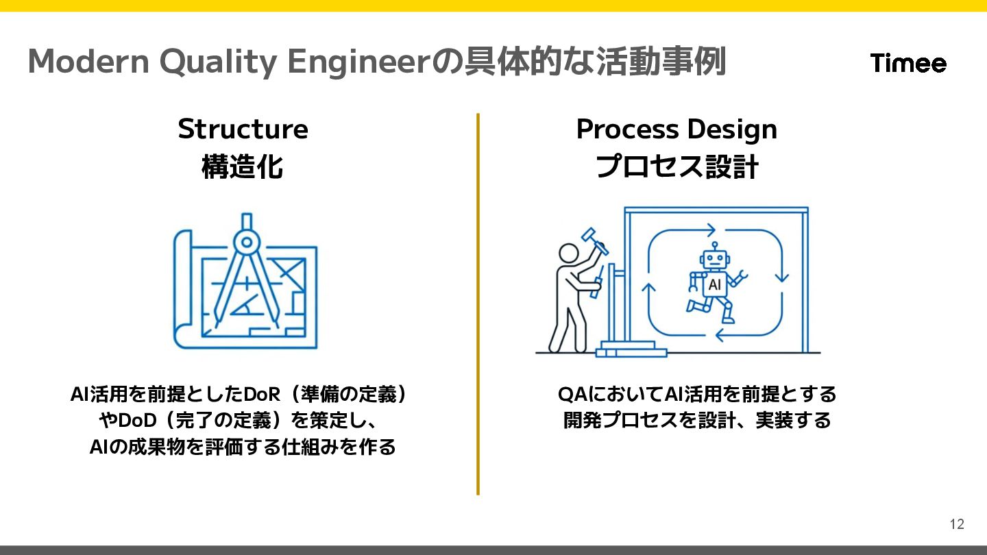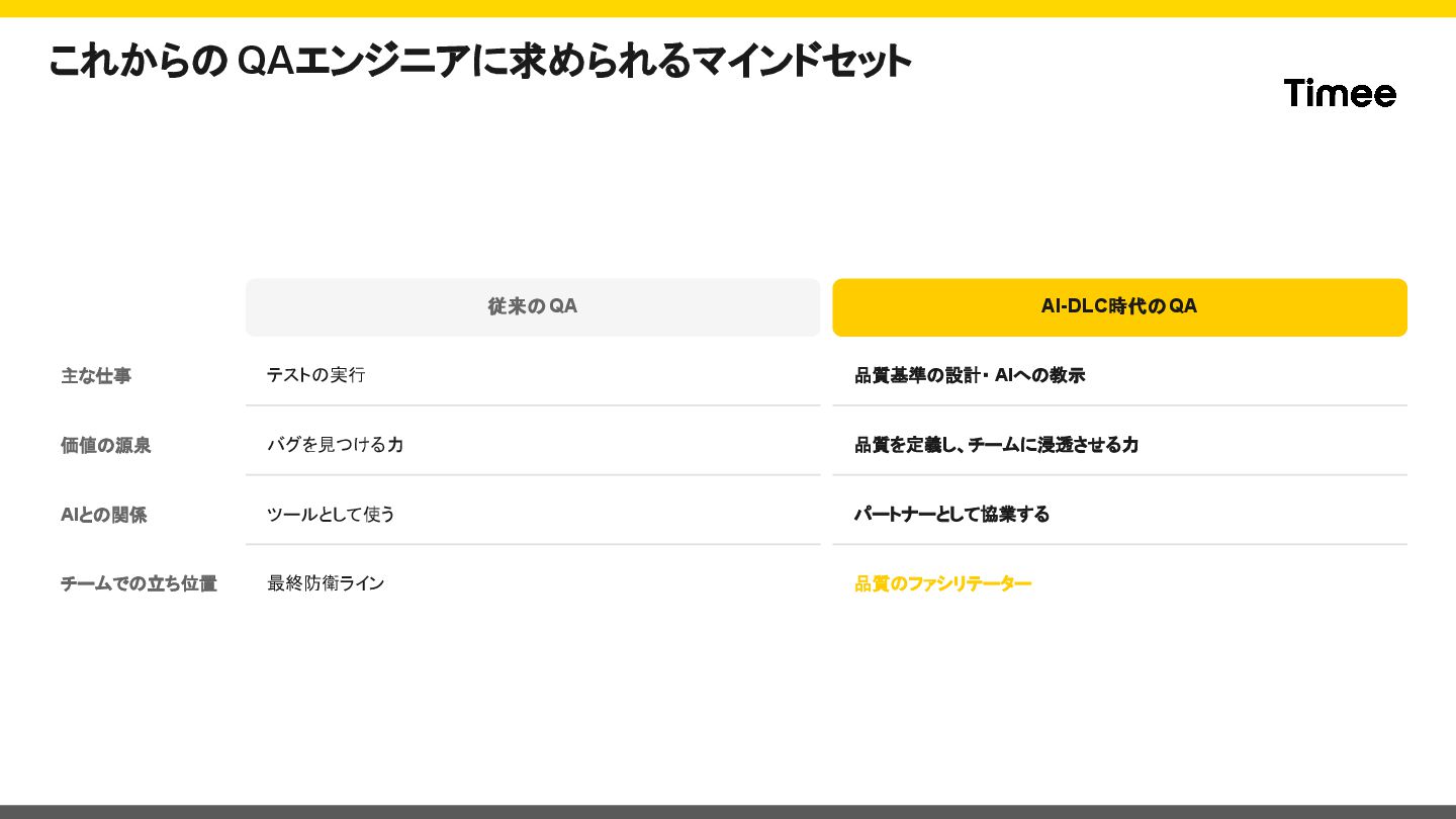 品質を定義し、チームに浸透させる力 AIとの関係 ツールとして使う パートナーとして協業する チームでの立ち位置 最終防衛ライン 品質のファシリテーター