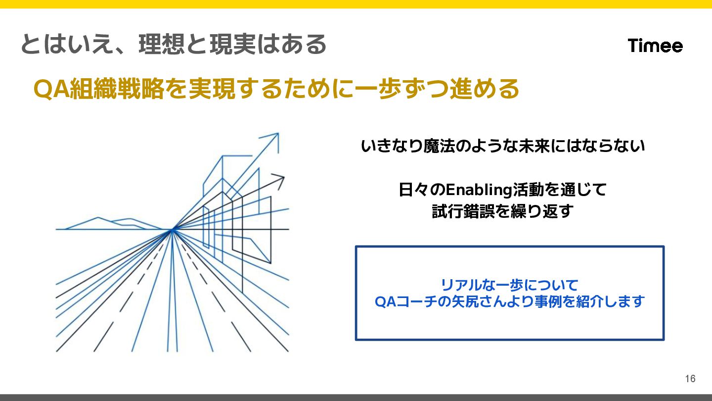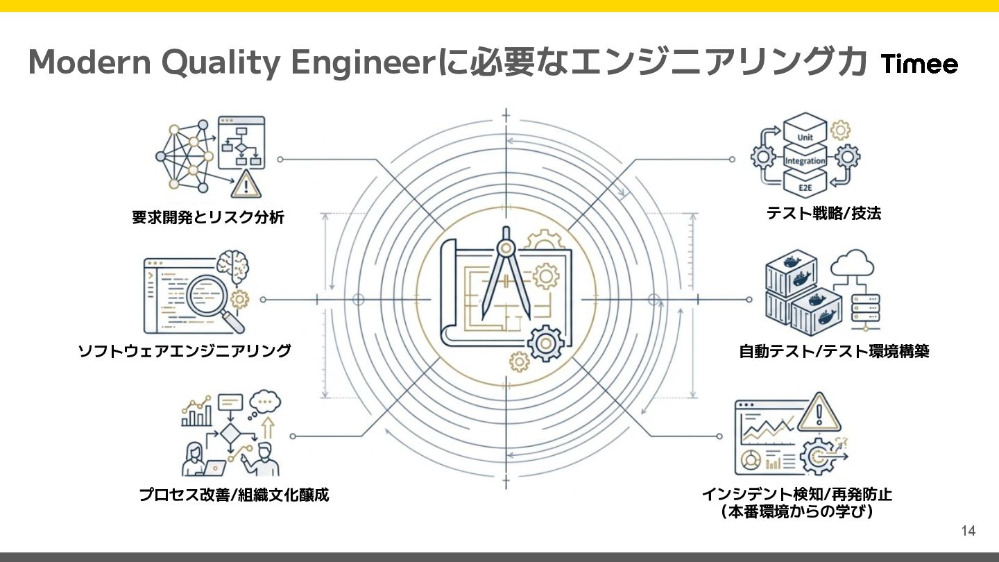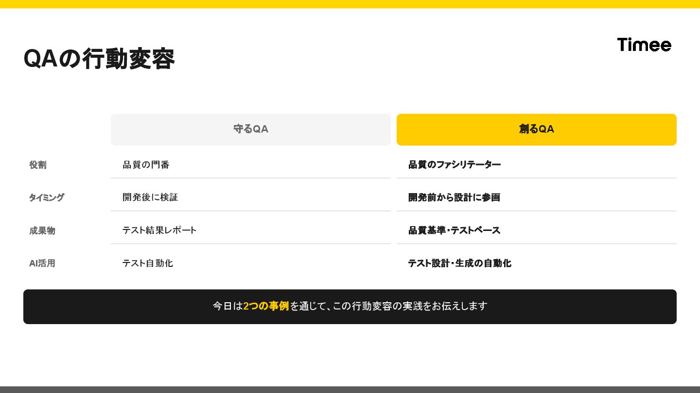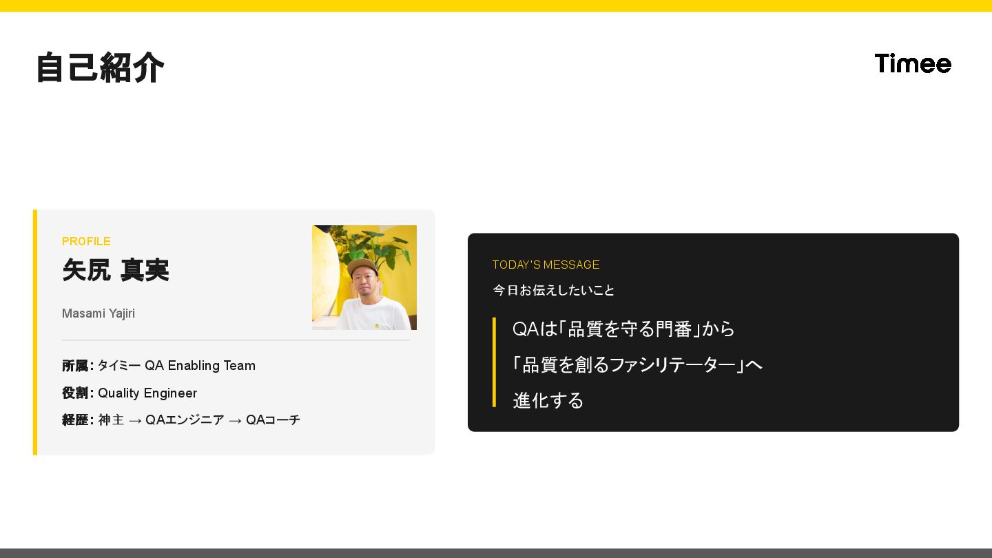 Team 役割: Quality Engineer 経歴: 神主 → QAエンジニア → QAコーチ TODAY'S MESSAGE 今日お伝えしたいこと QAは「品質を守る門番」から 「品質を創るファシリテーター」へ 進化する