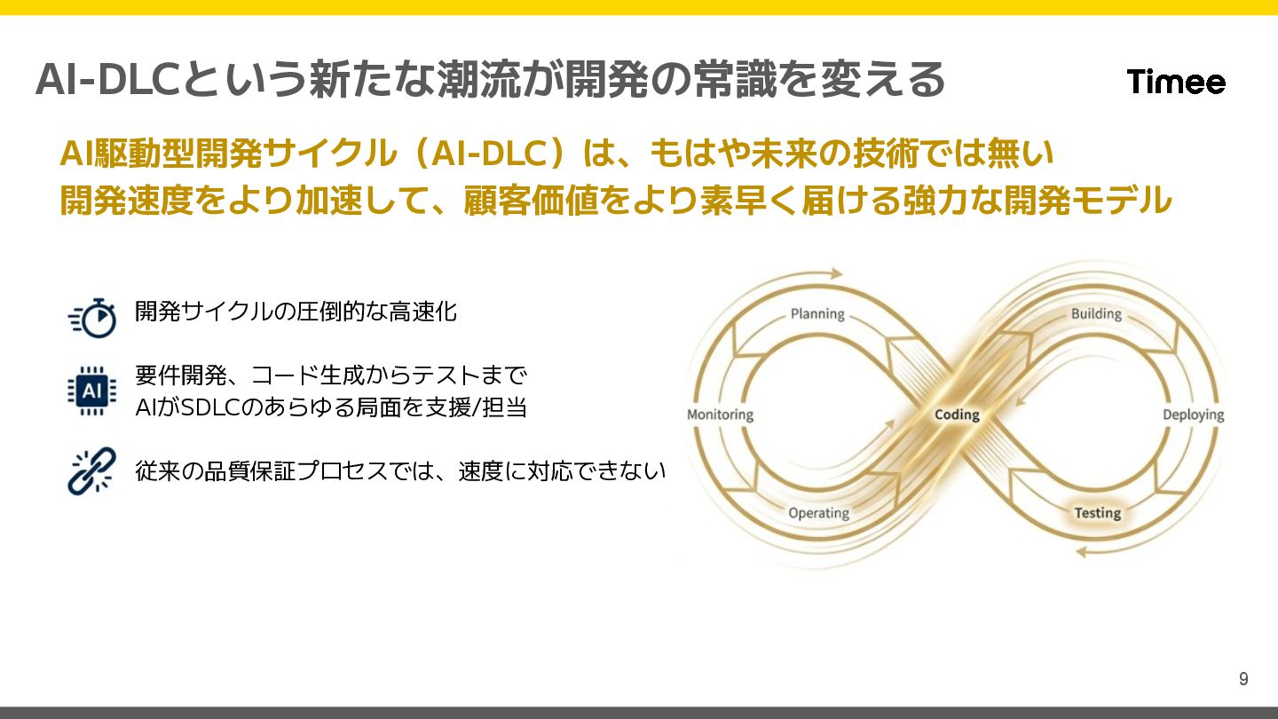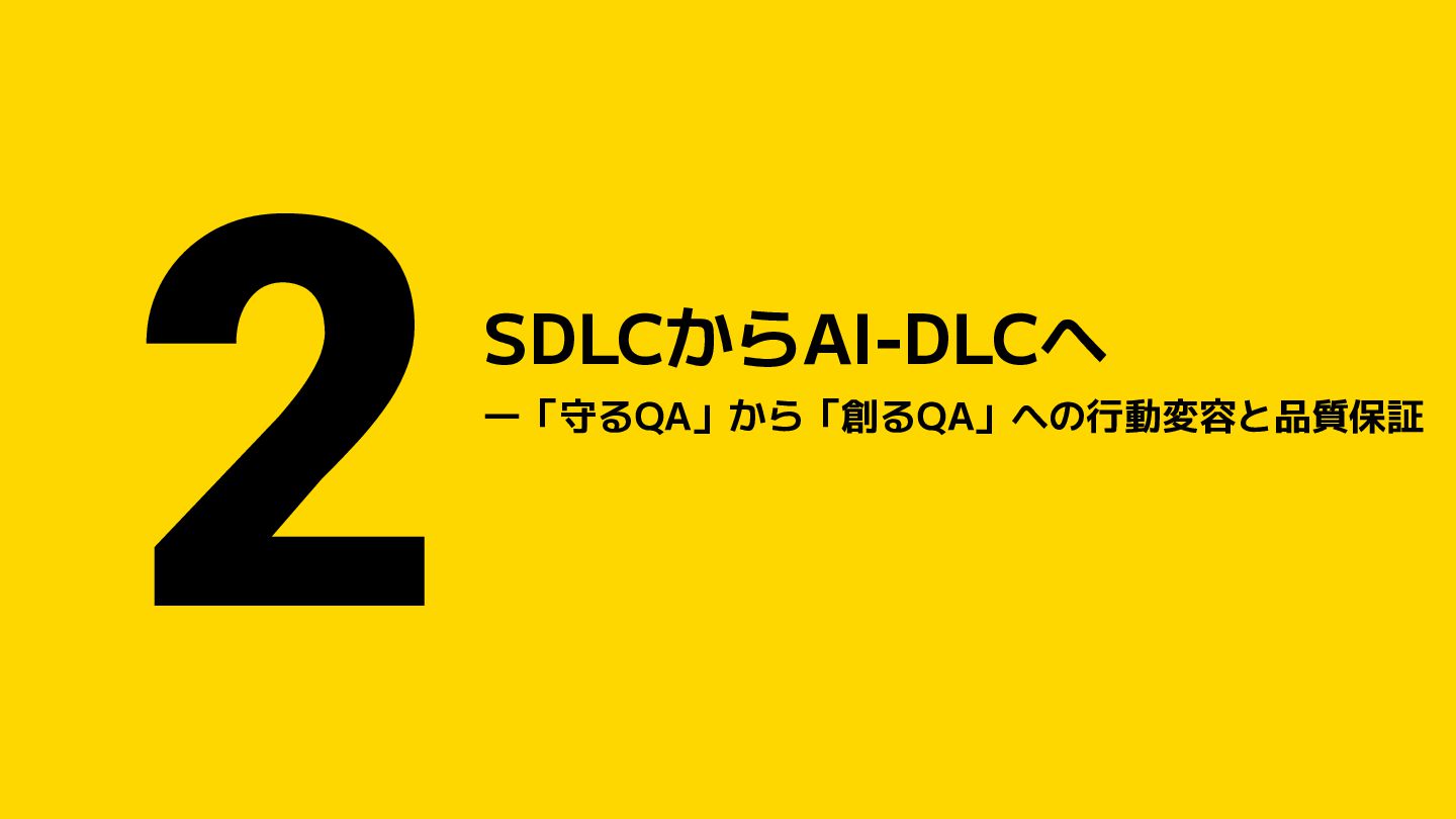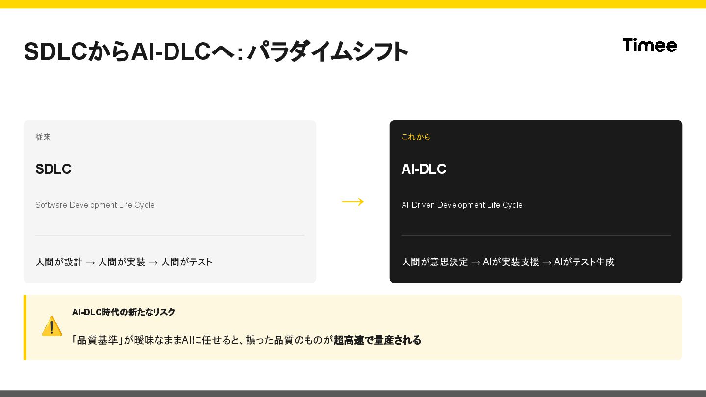 → 人間がテスト → これから AI-DLC AI-Driven Development Life Cycle 人間が意思決定 → AIが実装支援 → AIがテスト生成 ⚠ AI-DLC時代の新たなリスク 「品質基準」が曖昧なままAIに任せると、誤った品質のものが超高速で量産される