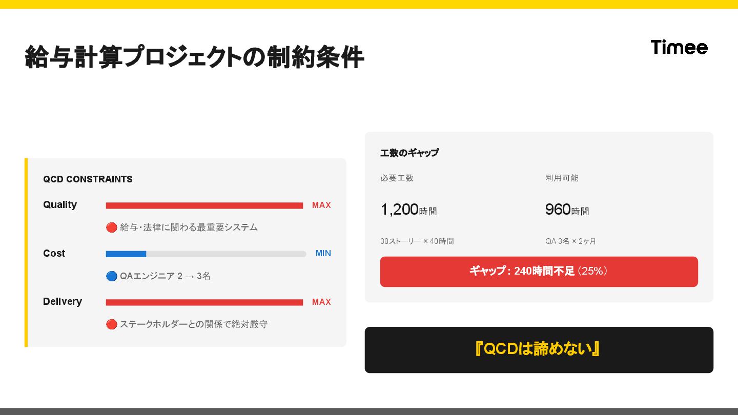 QAエンジニア 2 → 3名 Delivery MAX 🔴 ステークホルダーとの関係で絶対厳守 工数のギャップ 必要工数 1,200時間 30ストーリー × 40時間 利用可能 960時間 QA 3名 × 2ヶ月 ギャップ: 240時間不足(25%) 『QCDは諦めない』