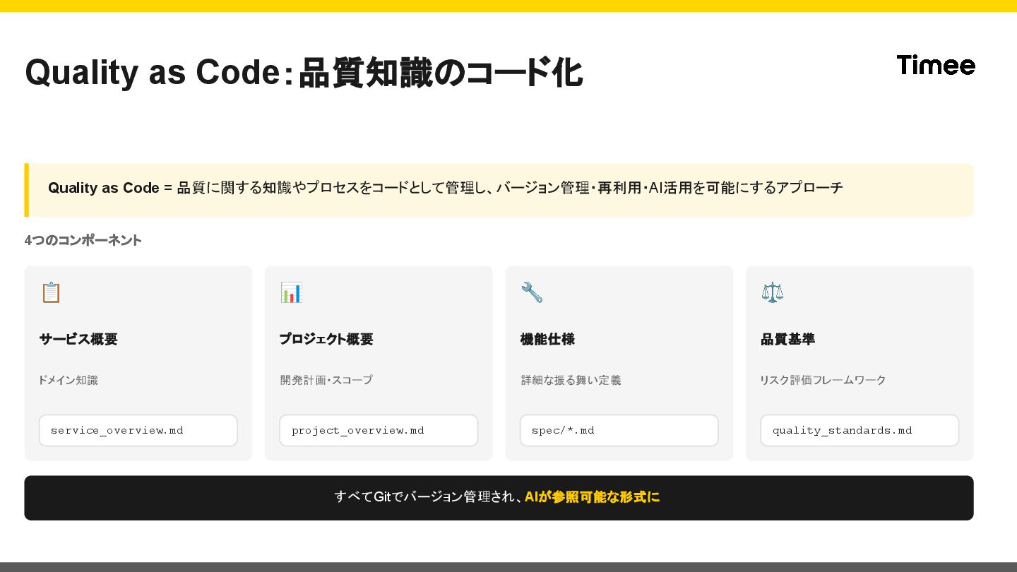 9. Quality as Code:品質知識のコード化 Quality as Code = 品質に関する知識やプロセスをコードとして管理し、バージョン管理・再利用・AI活用を可能にするアプローチ 4つのコンポーネント 📋