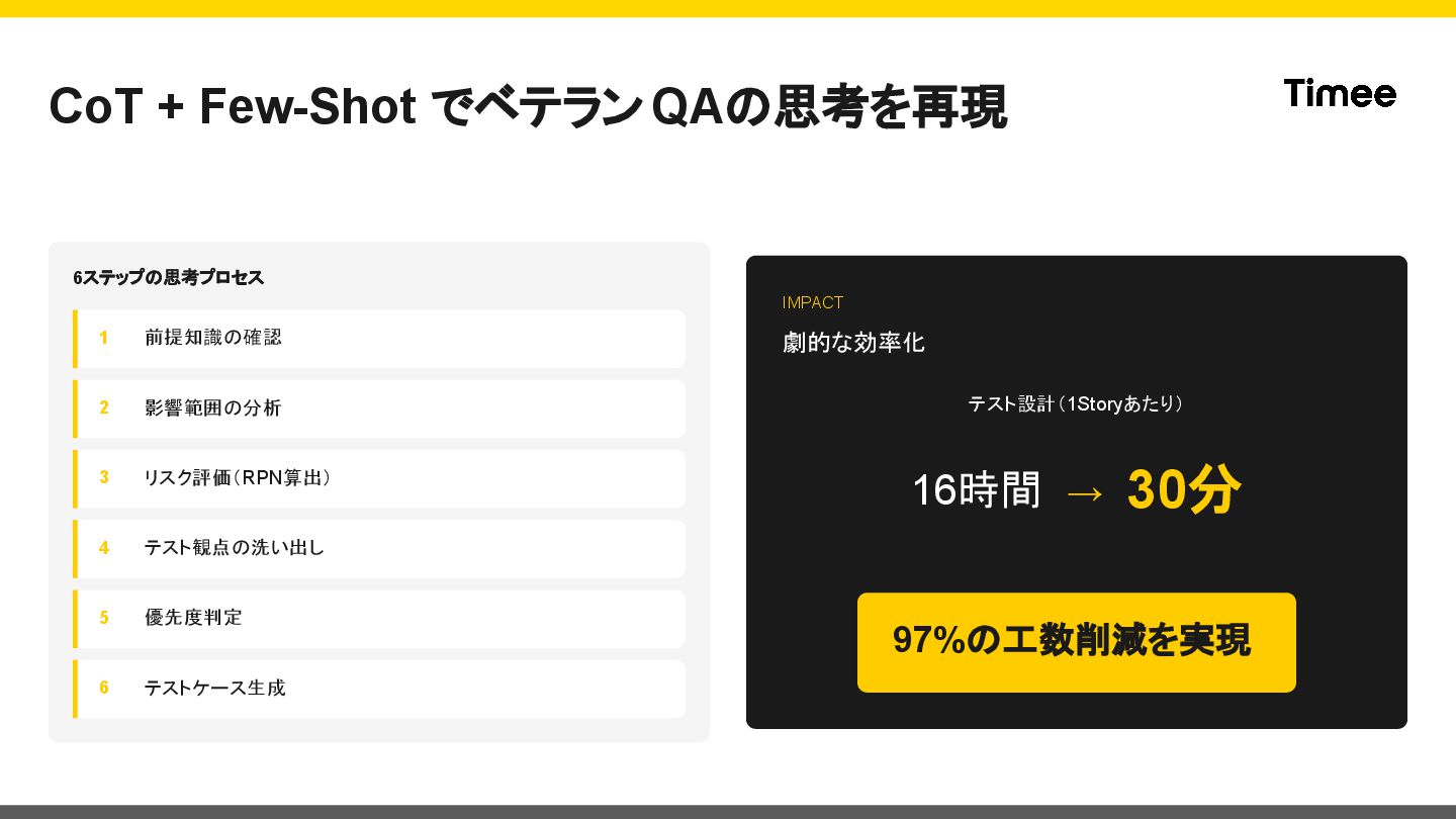 3 リスク評価(RPN算出) 4 テスト観点の洗い出し 5 優先度判定 6 テストケース生成 IMPACT 劇的な効率化 テスト設計(1Storyあたり) 16時間 → 30分 97%の工数削減を実現