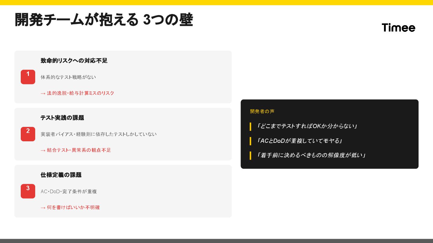 12. 開発チームが抱える 3つの壁 1 致命的リスクへの対応不足 体系的なテスト戦略がない → 法的逸脱・給与計算ミスのリスク 2 テスト実践の課題 実装者バイアス・経験則に依存したテストしかしていない