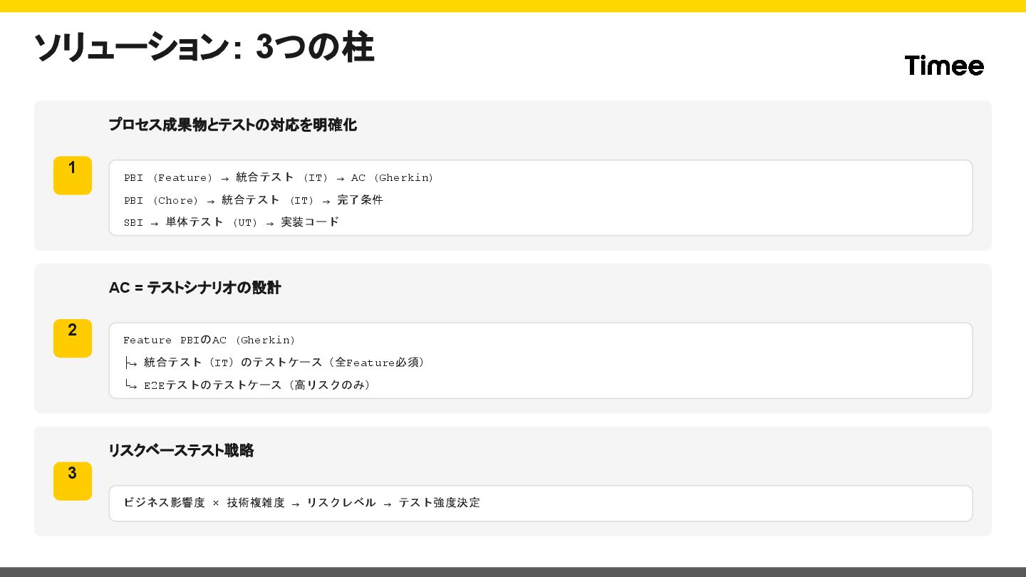 AC (Gherkin) PBI (Chore) → 統合テスト (IT) → 完了条件 SBI → 単体テスト (UT) → 実装コード 2 AC = テストシナリオの設計 Feature PBIのAC (Gherkin) ├→ 統合テスト(IT)のテストケース(全Feature必須) └→ E2Eテストのテストケース(高リスクのみ) 3 リスクベーステスト戦略 ビジネス影響度 × 技術複雑度 → リスクレベル → テスト強度決定