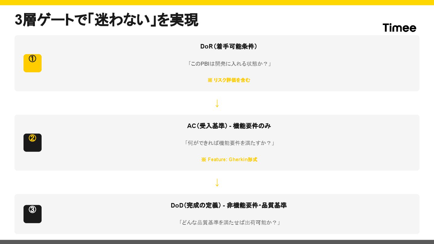 14. 3層ゲートで「迷わない」を実現 ① DoR(着手可能条件) 「このPBIは開発に入れる状態か?」 ※ リスク評価を含む ↓ ② AC(受入基準) -