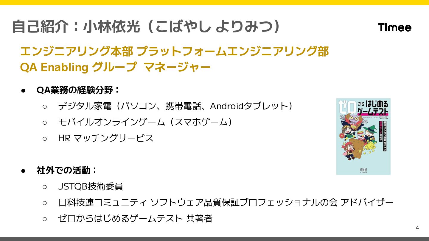 社外での活動: ◦ JSTQB技術委員 ◦ 日科技連コミュニティ ソフトウェア品質保証プロフェッショナルの会 アドバイザー ◦ ゼロからはじめるゲームテスト 共著者 4 自己紹介:小林依光(こばやし よりみつ) エンジニアリング本部 プラットフォームエンジニアリング部 QA Enabling グループ マネージャー
