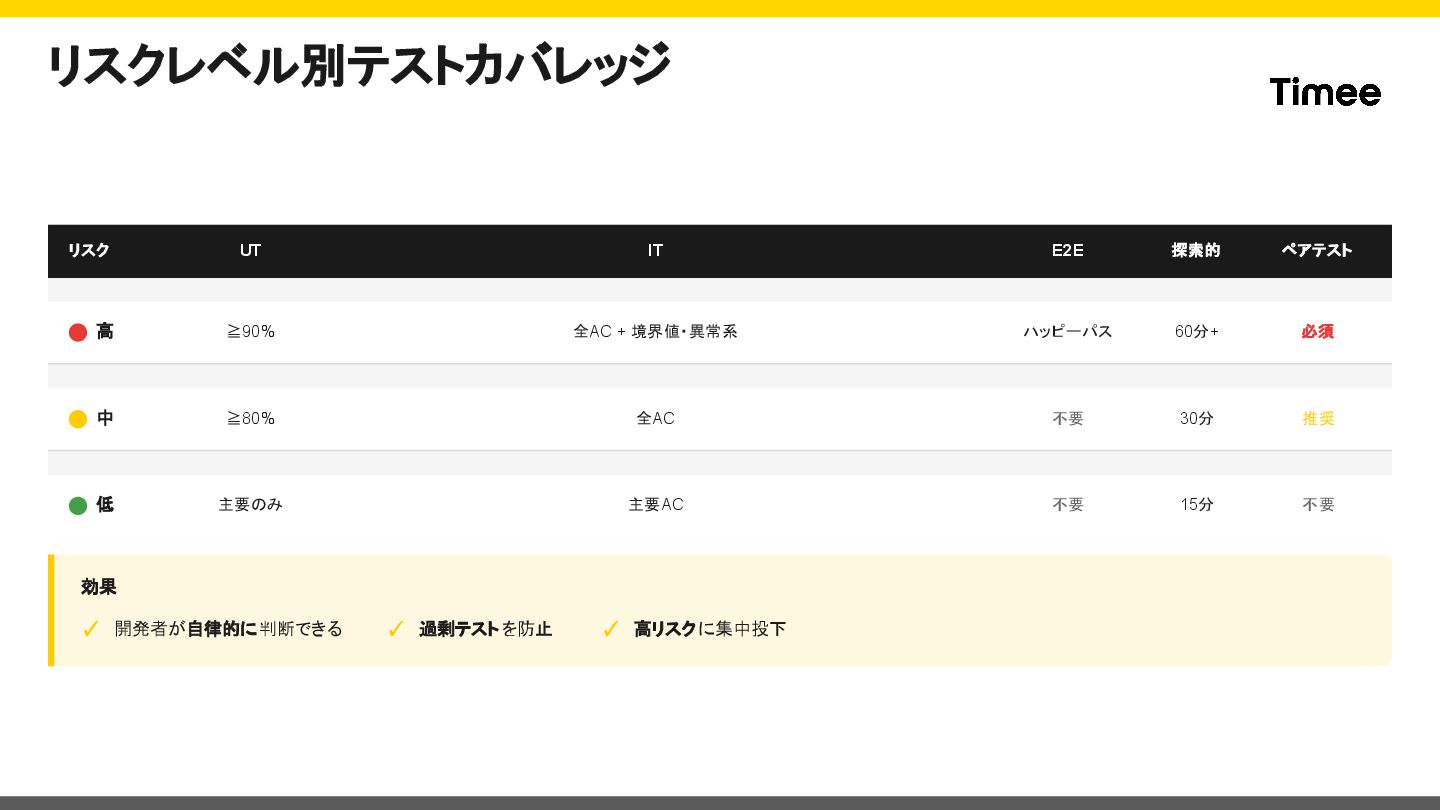 + 境界値・異常系 ハッピーパス 60分+ 必須 中 ≧80% 全AC 不要 30分 推奨 低 主要のみ 主要AC 不要 15分 不要 効果 ✓ 開発者が自律的に判断できる ✓ 過剰テスト を防止 ✓ 高リスクに集中投下