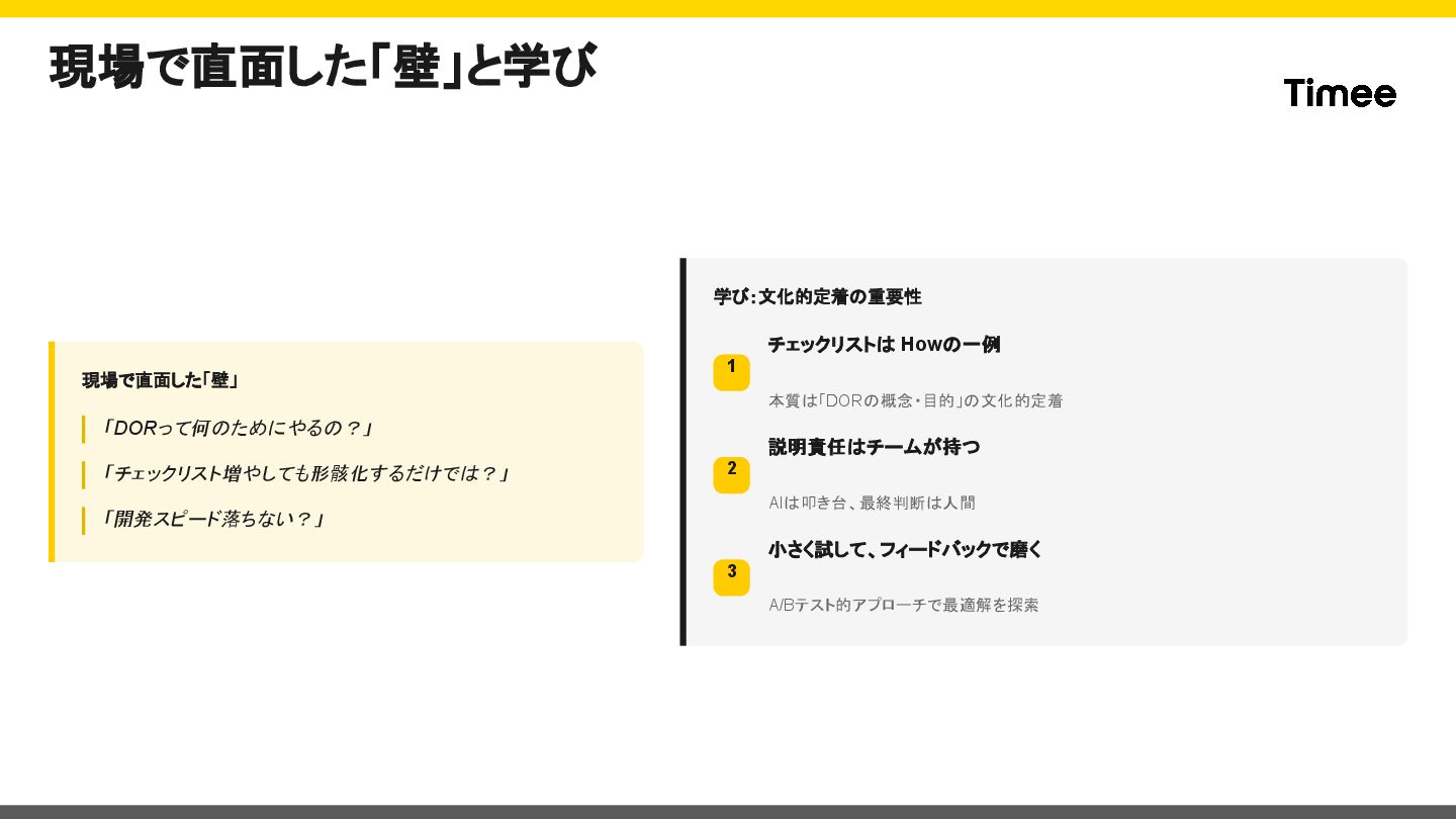 → 結合テスト・異常系の観点不足 3 仕様定義の課題 AC・DoD・完了条件が重複 → 何を書けばいいか不明確 開発者の声 「どこまでテストすればOKか分からない」 「ACとDoDが重複していてモヤる」 「着手前に決めるべきものの解像度が低い」
