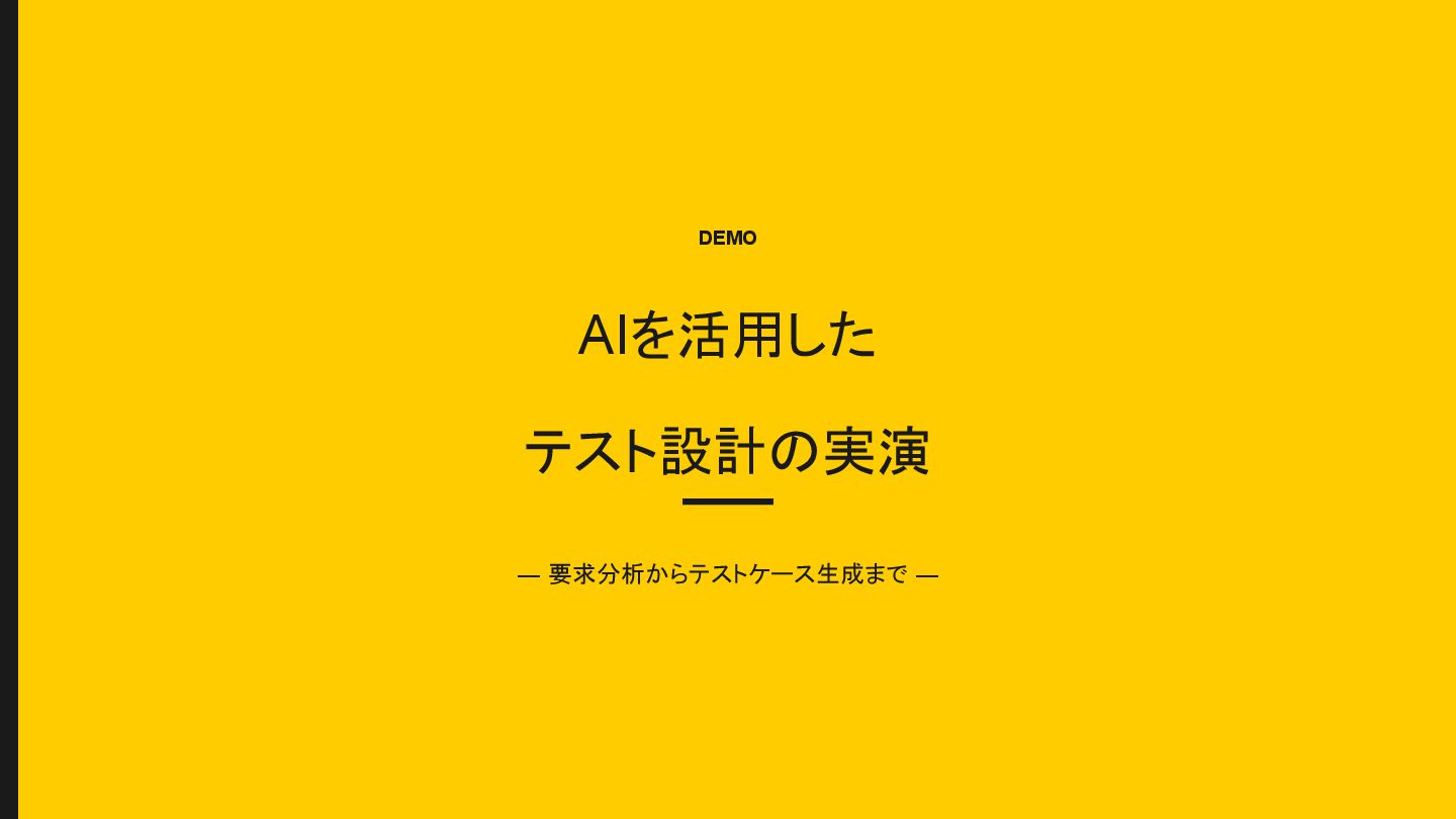Detectability (影響度 × 発生確率 × 検知困難性) P1 (RPN ≥ 25) 異常系・境界値まで徹底網羅 P2 (RPN 10-24) 主要シナリオを重点カバー P3 (RPN < 10) ハッピーパス中心 効果 ✓ 客観的な基準 でテストの深さを自動判定 ✓ チーム全員が同じ物差し で品質を語れる ✓ 過剰テスト とテスト不足 の両方を防止
