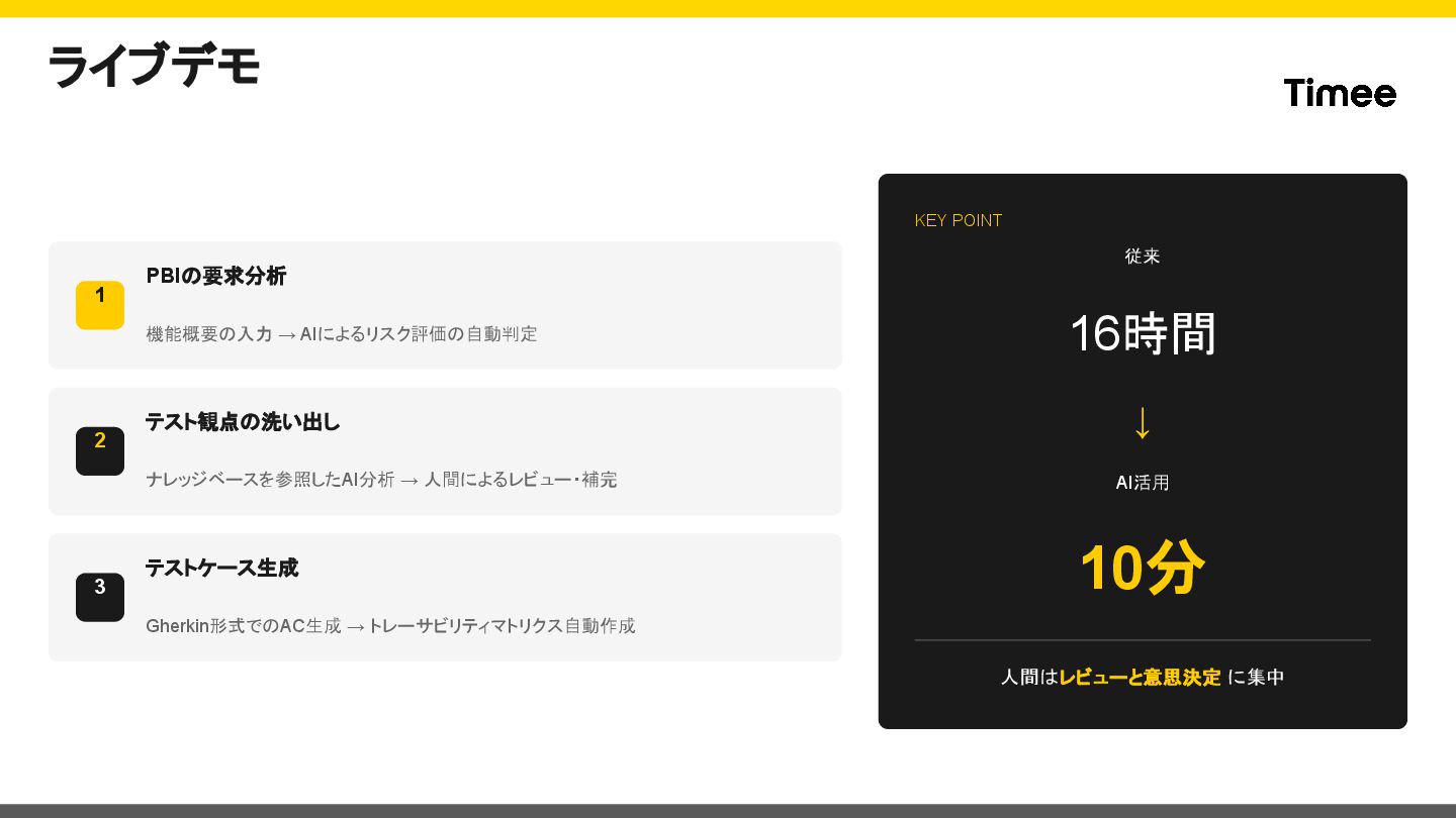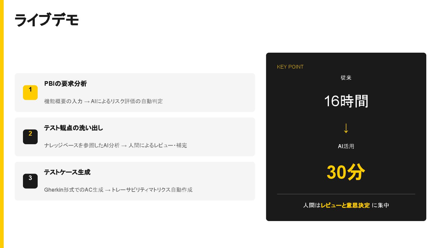 人間によるレビュー・補完 3 テストケース生成 Gherkin形式でのAC生成 → トレーサビリティマトリクス自動作成 KEY POINT 従来 16時間 ↓ AI活用 10分 人間はレビューと意思決定 に集中