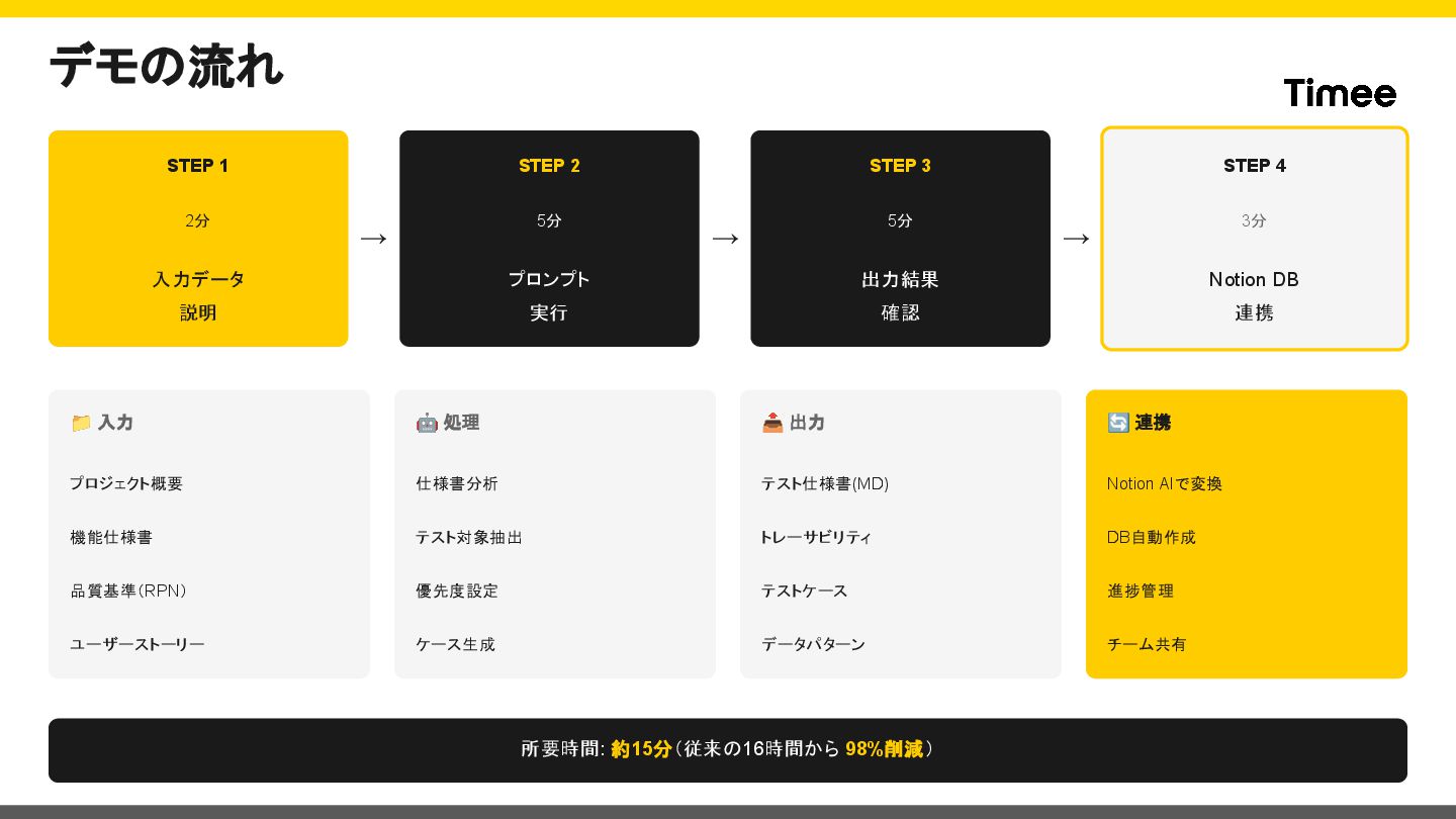 プロンプト 実行 → STEP 3 5分 出力結果 確認 → STEP 4 3分 Notion DB 連携 📁 入力 プロジェクト概要 機能仕様書 品質基準(RPN) ユーザーストーリー 🤖 処理 仕様書分析 テスト対象抽出 優先度設定 ケース生成 📤 出力 テスト仕様書(MD) トレーサビリティ テストケース データパターン 🔄 連携 Notion AIで変換 DB自動作成 進捗管理 チーム共有 所要時間: 約15分(従来の16時間から 98%削減)