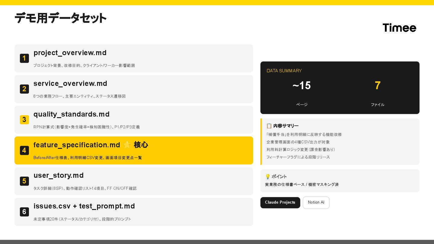 4 feature_specification.md ⭐ 核心 Before/After仕様表、利用明細CSV変更、画面項目変更点一覧 5 user_story.md タスク詳細(8SP)、動作確認リスト14項目、FF ON/OFF確認 6 issues.csv + test_prompt.md 未定事項20件(ステータス/カテゴリ付)、段階的プロンプト DATA SUMMARY ~15 ページ 7 ファイル 📋 内容サマリー 「補償手当」を利用明細に反映する機能改修 企業管理画面の4種CSV出力が対象 利用料計算ロジック変更(課金影響あり) フィーチャーフラグによる段階リリース 💡 ポイント 実業務の仕様書ベース / 機密マスキング済 Claude Projects Notion AI