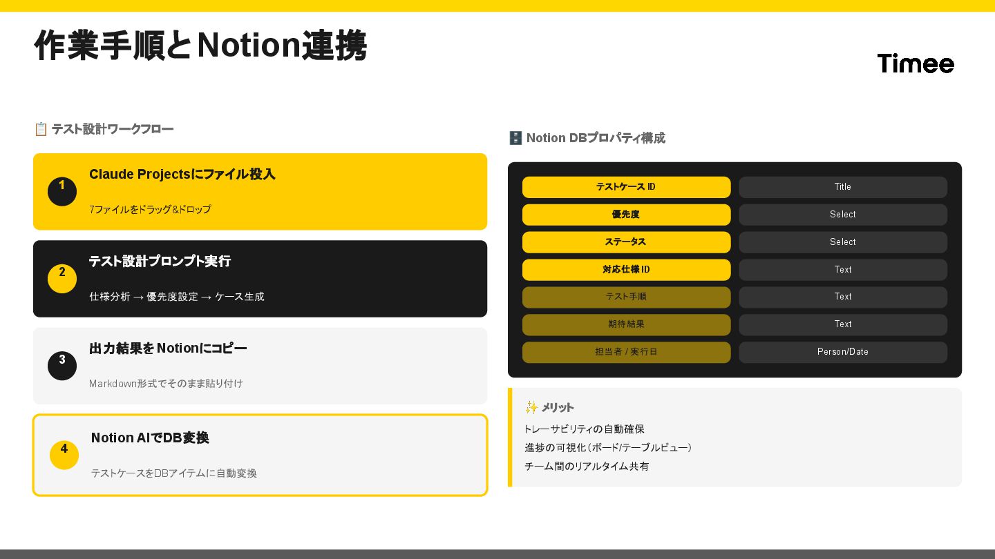 仕様分析 → 優先度設定 → ケース生成 3 出力結果を Notionにコピー Markdown形式でそのまま貼り付け 4 Notion AIでDB変換 テストケースをDBアイテムに自動変換 🗄 Notion DBプロパティ構成 テストケース ID Title 優先度 Select ステータス Select 対応仕様ID Text テスト手順 Text 期待結果 Text 担当者 / 実行日 Person/Date ✨ メリット トレーサビリティの自動確保 進捗の可視化(ボード/テーブルビュー) チーム間のリアルタイム共有
