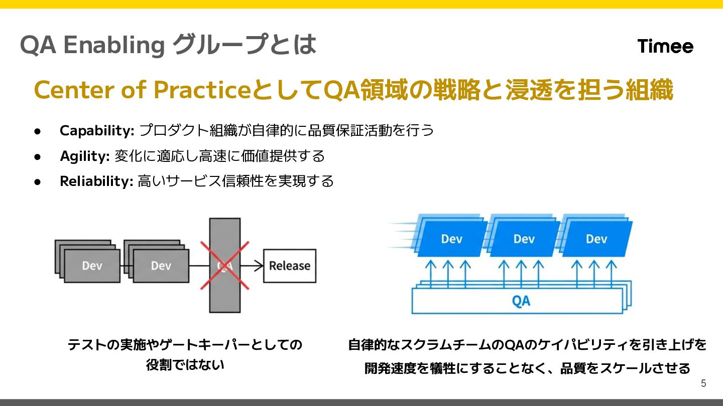 QA Enabling グループとは Center of PracticeとしてQA領域の戦略と浸透を担う組織 テストの実施やゲートキーパーとしての 役割ではない 自律的なスクラムチームのQAのケイパビリティを引き上げを 開発速度を犠牲にすることなく、品質をスケールさせる