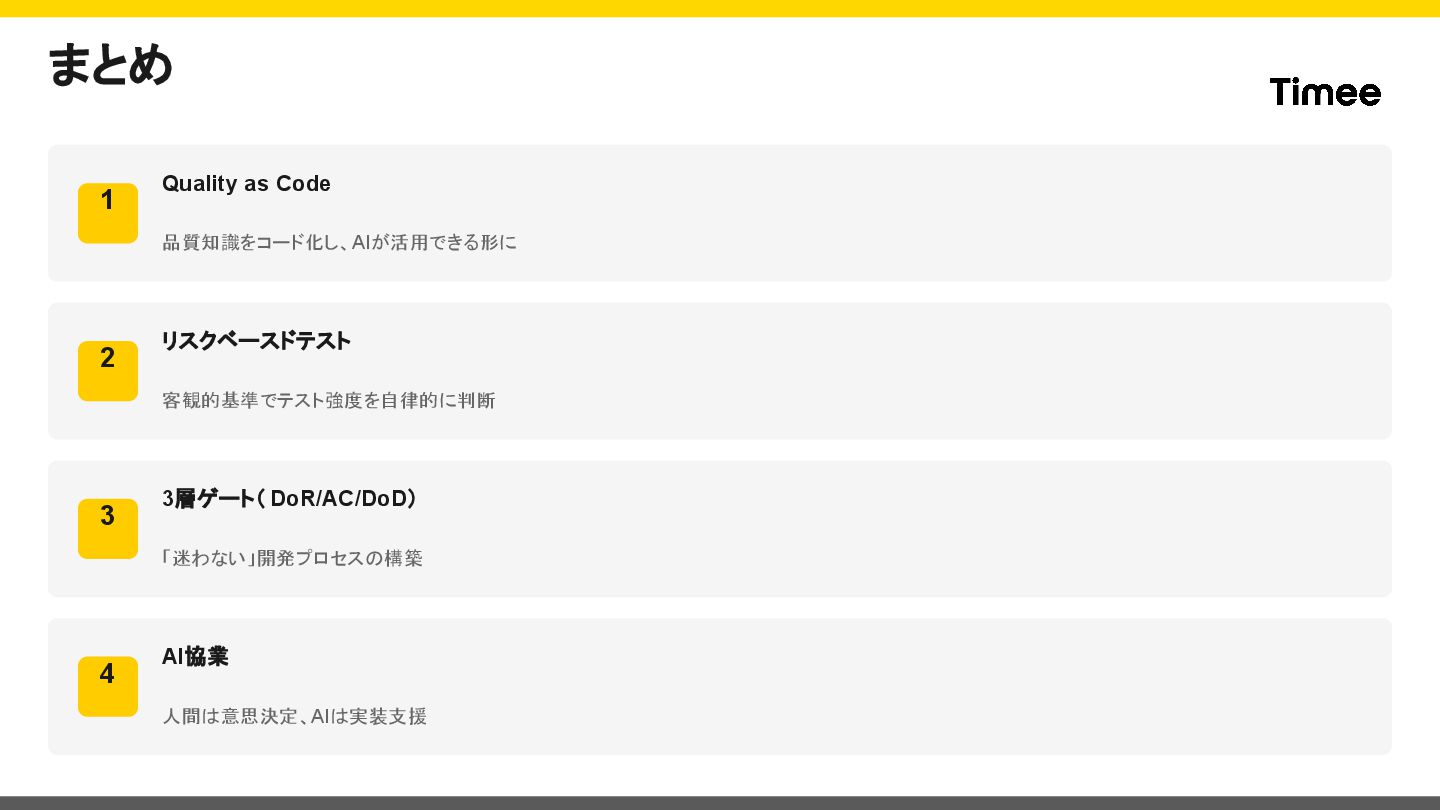 22. まとめ 1 Quality as Code 品質知識をコード化し、AIが活用できる形に 2 リスクベースドテスト 客観的基準でテスト強度を自律的に判断 3