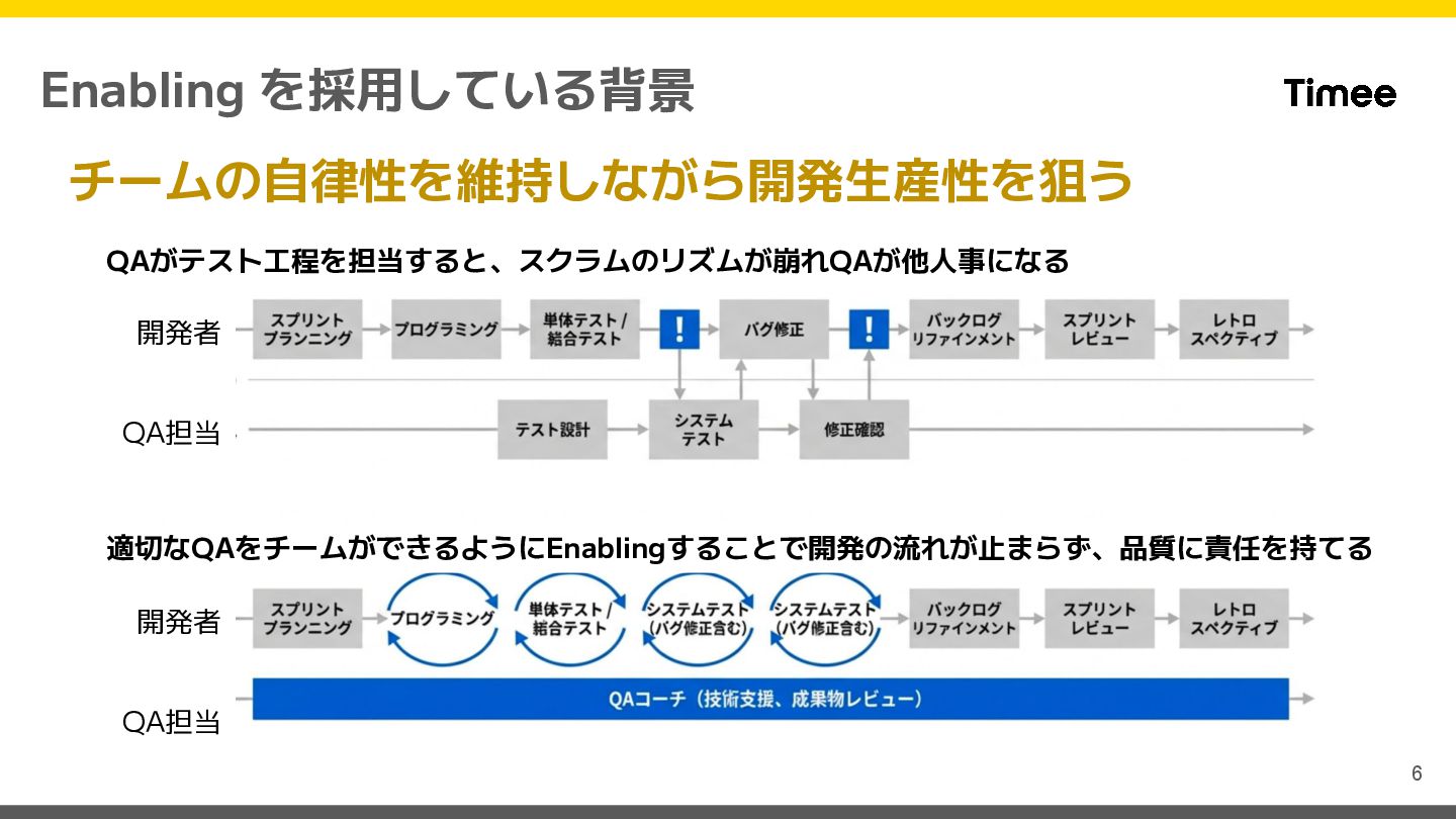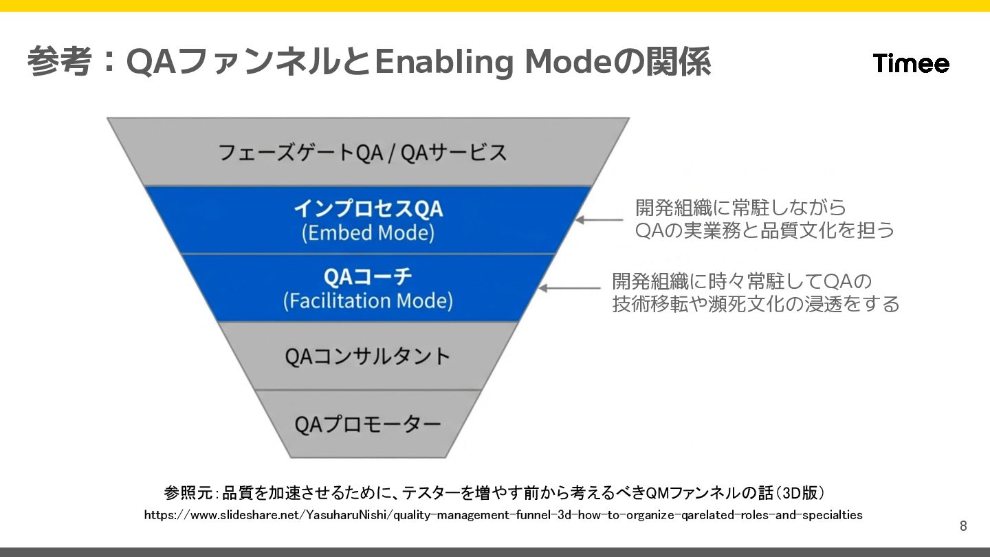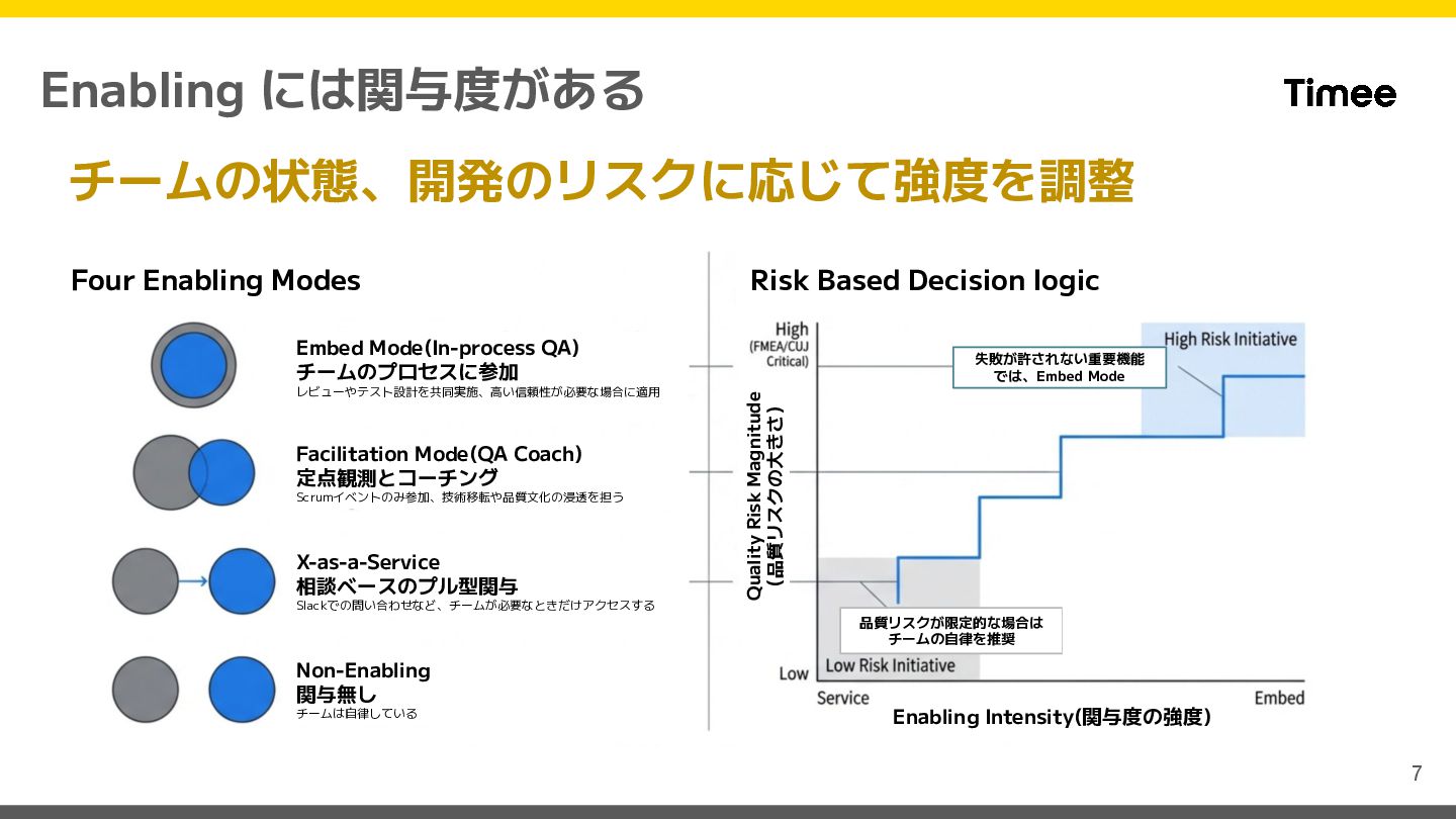 logic Embed Mode(In-process QA) チームのプロセスに参加 レビューやテスト設計を共同実施、高い信頼性が必要な場合に適用 Facilitation Mode(QA Coach) 定点観測とコーチング Scrumイベントのみ参加、技術移転や品質文化の浸透を担う X-as-a-Service 相談ベースのプル型関与 Slackでの問い合わせなど、チームが必要なときだけアクセスする Non-Enabling 関与無し チームは自律している Enabling Intensity(関与度の強度) 失敗が許されない重要機能 では、Embed Mode 品質リスクが限定的な場合は チームの自律を推奨 Quality Risk Magnitude (品質リスクの大きさ)