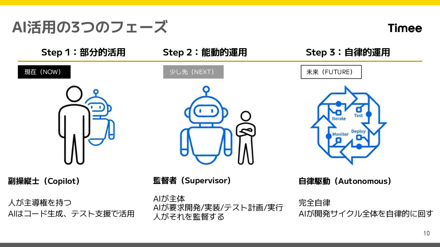 3:自律的運用 副操縦士(Copilot) 人が主導権を持つ AIはコード生成、テスト支援で活用 監督者(Supervisor) AIが主体 AIが要求開発/実装/テスト計画/実行 人がそれを監督する 自律駆動(Autonomous) 完全自律 AIが開発サイクル全体を自律的に回す