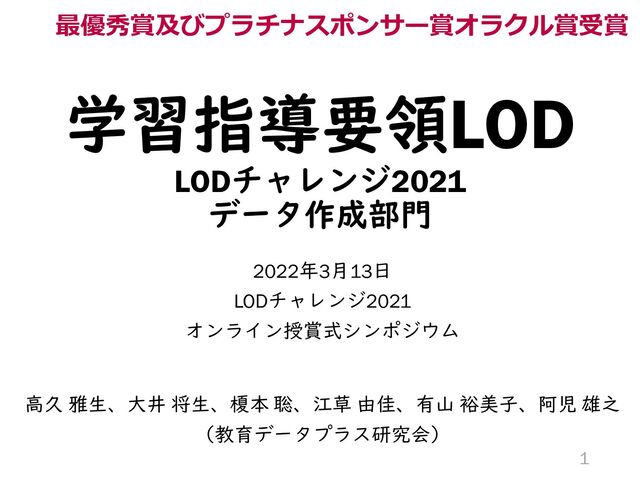 学習指導要領LOD LODチャレンジ2021 データ作成部門 2022年3月13日 LODチャレンジ2021 オンライン授賞式シンポジウム 高久 雅生、大井 将生、榎本 聡、江草