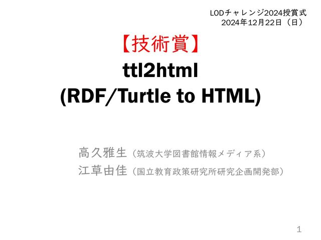 【技術賞】 ttl2html (RDF/Turtle to HTML) 高久雅生(筑波大学図書館情報メディア系) 江草由佳(国立教育政策研究所研究企画開発部) 1 LODチャレンジ2024授賞式 2024年12月22日(日)