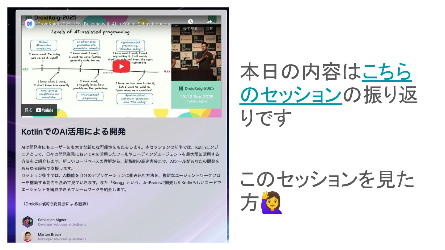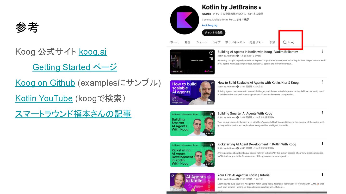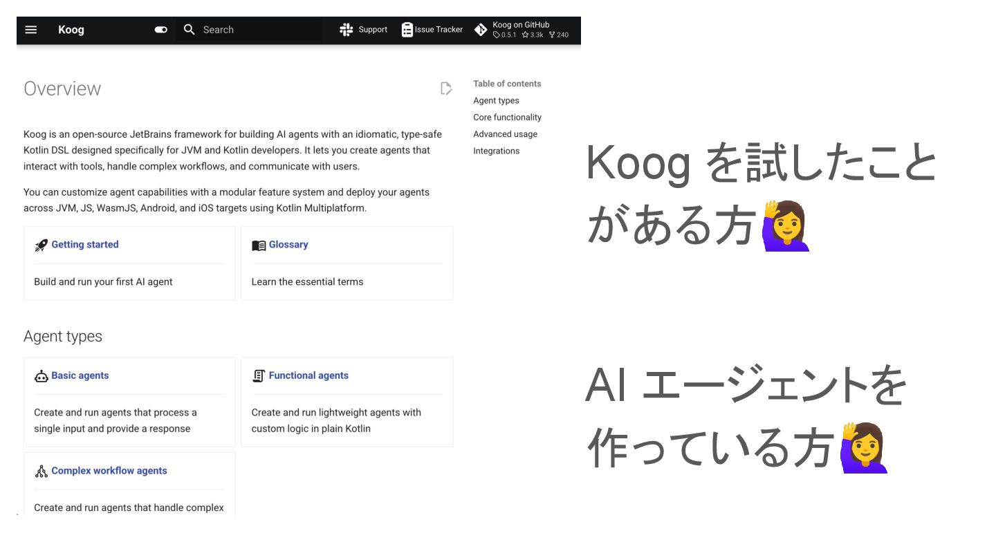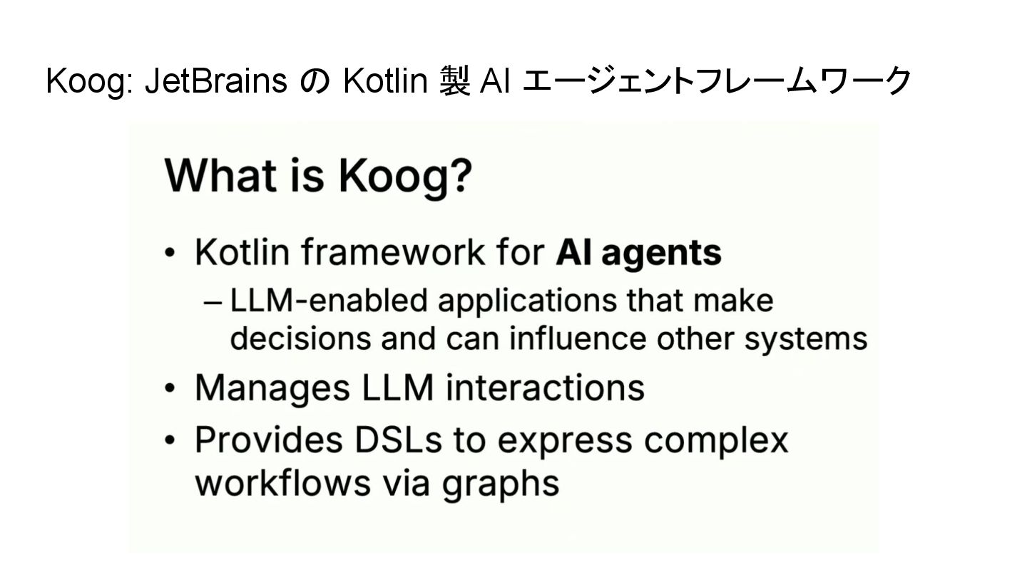 Droidkaigi 2025 の JetBrains セッション「KotlinでのAI活用による開発」https://2025.droidkaigi.jp/timetable/989391/ の後半Koog パートを自分の視点で再構成してまとめてみました。