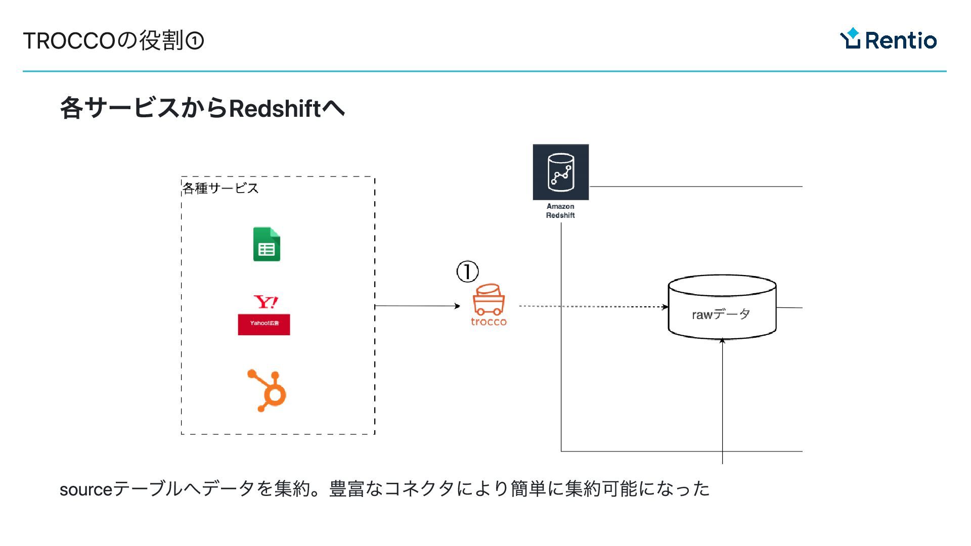 各サービスからRedshiftへ sourceテーブルへデータを集約。豊富なコネクタにより簡単に集約可能になった TROCCOの役割①