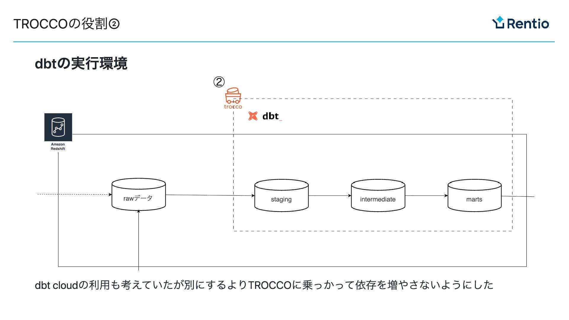 dbtの実行環境 dbt cloudの利用も考えていたが別にするよりTROCCOに乗っかって依存を増やさないようにした TROCCOの役割②