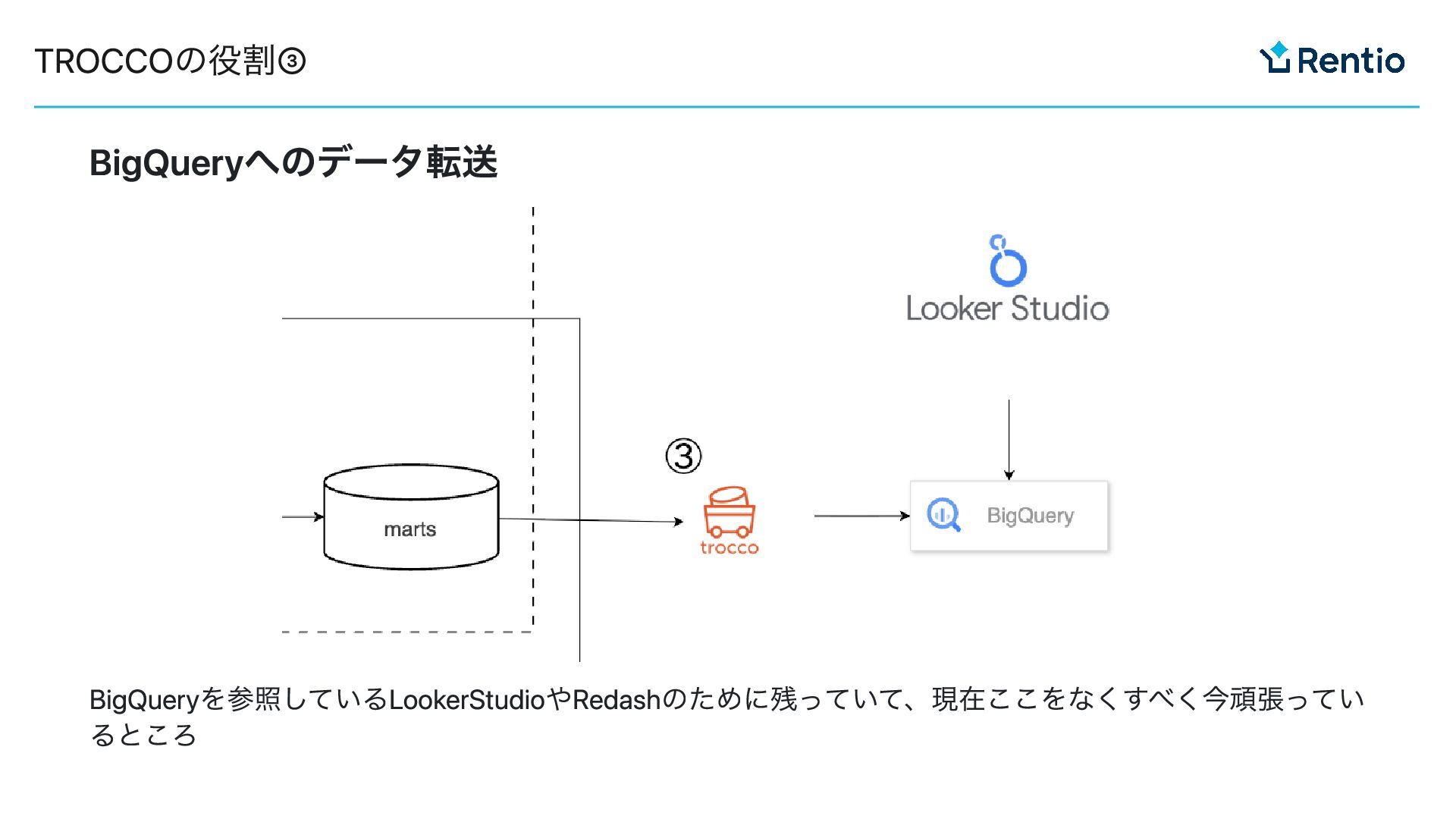BigQueryへのデータ転送 BigQueryを参照しているLookerStudioやRedashのために残っていて、現在ここをなくすべく今頑張ってい るところ TROCCOの役割③