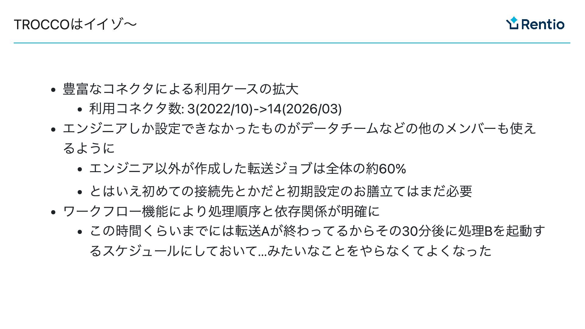 豊富なコネクタによる利用ケースの拡大 利用コネクタ数: 3(2022/10)->14(2026/03) エンジニアしか設定できなかったものがデータチームなどの他のメンバーも使え るように エンジニア以外が作成した転送ジョブは全体の約60% とはいえ初めての接続先とかだと初期設定のお膳立てはまだ必要 ワークフロー機能により処理順序と依存関係が明確に この時間くらいまでには転送Aが終わってるからその30分後に処理Bを起動す るスケジュールにしておいて...みたいなことをやらなくてよくなった