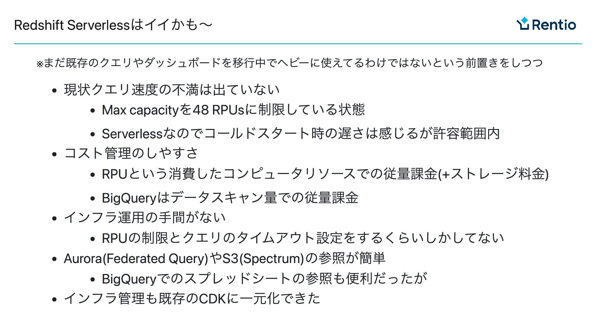 インフラ運用の手間がない RPUの制限とクエリのタイムアウト設定をするくらいしかしてない Aurora(Federated Query)やS3(Spectrum)の参照が簡単 BigQueryでのスプレッドシートの参照も便利だったが インフラ管理も既存のCDKに一元化できた Redshift Serverlessはイイかも〜