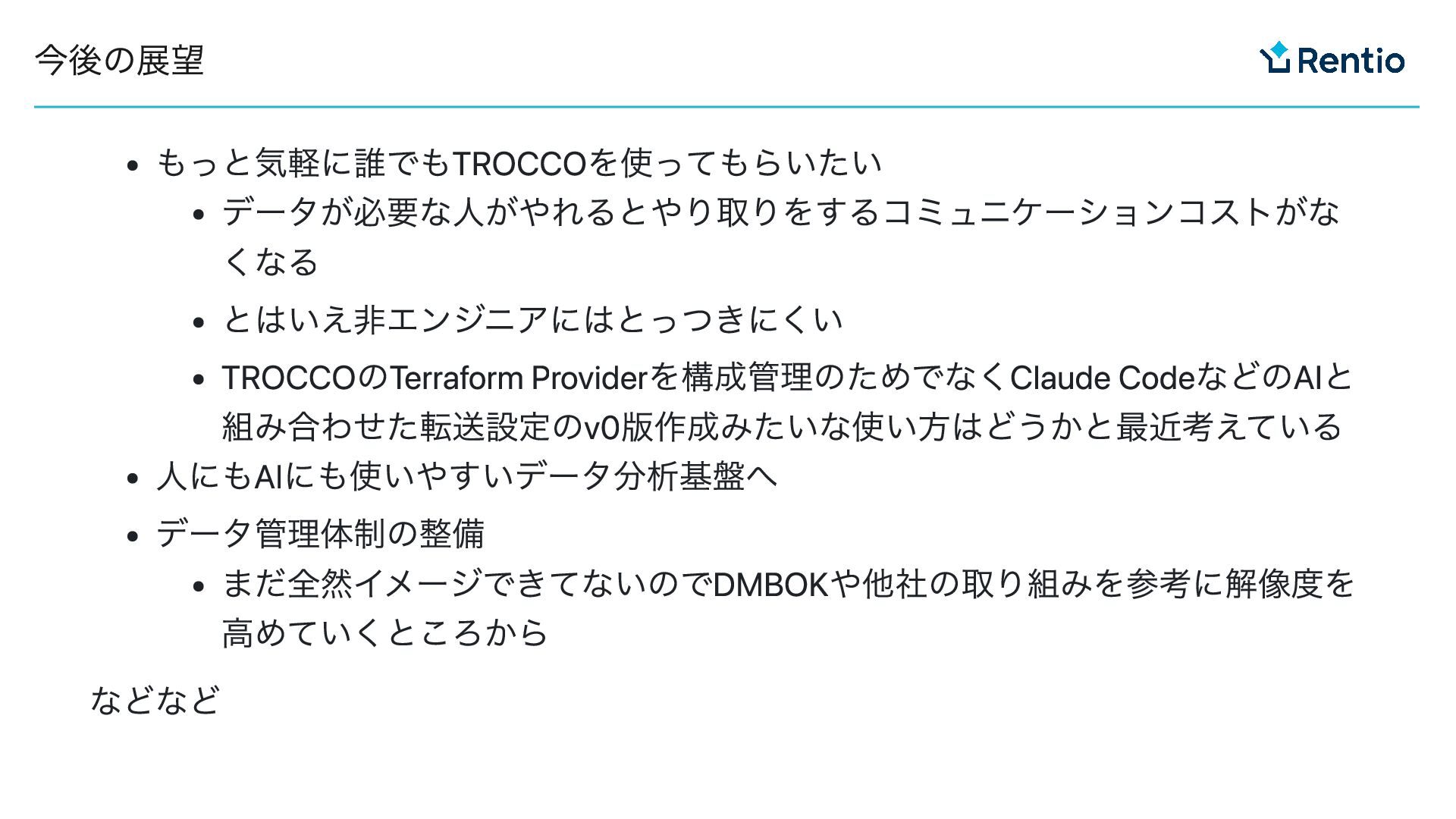 もっと気軽に誰でもTROCCOを使ってもらいたい データが必要な人がやれるとやり取りをするコミュニケーションコストがな くなる とはいえ非エンジニアにはとっつきにくい TROCCOのTerraform Providerを構成管理のためでなくClaude CodeなどのAIと 組み合わせた転送設定のv0版作成みたいな使い方はどうかと最近考えている 人にもAIにも使いやすいデータ分析基盤へ データ管理体制の整備