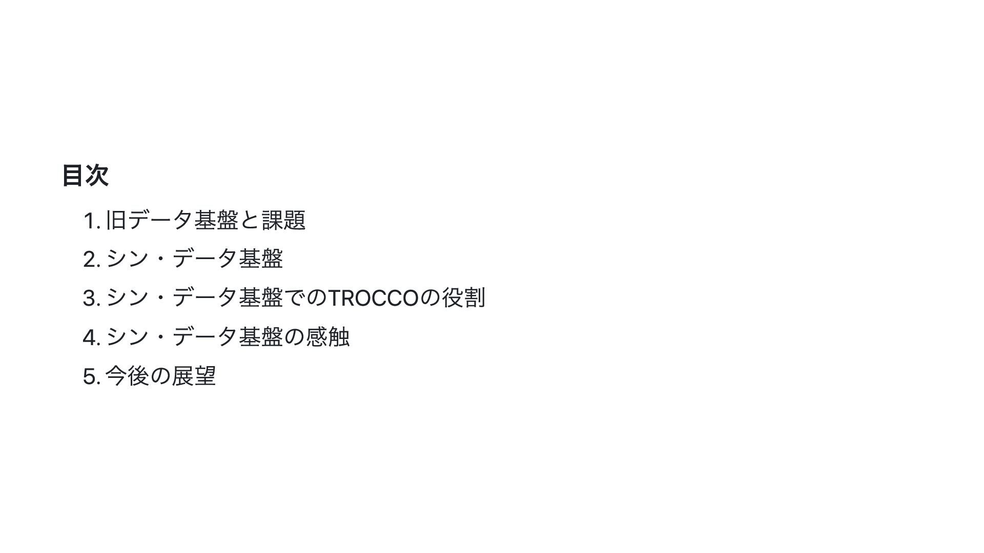 目次 1. 旧データ基盤と課題 2. シン・データ基盤 3. シン・データ基盤でのTROCCOの役割 4. シン・データ基盤の感触 5.