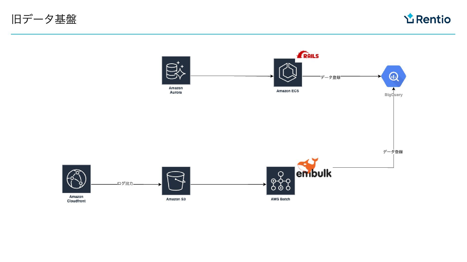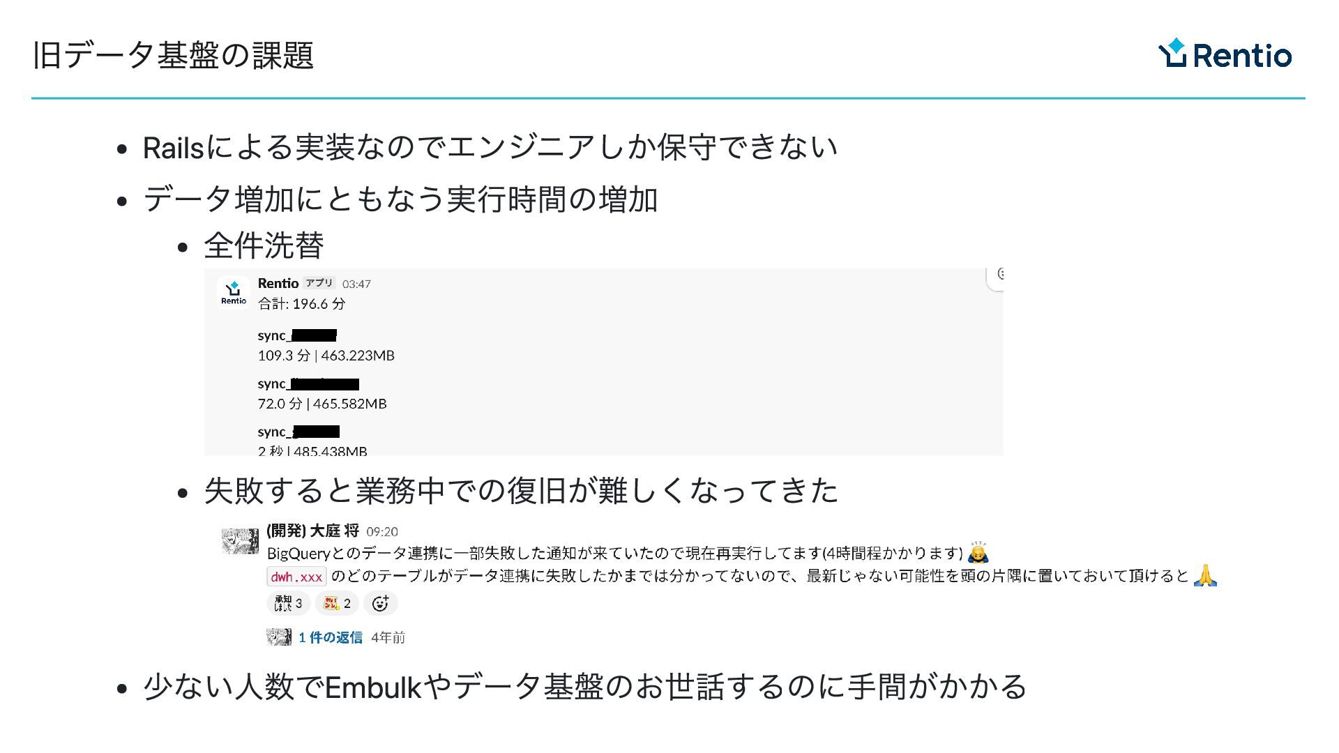Railsによる実装なのでエンジニアしか保守できない データ増加にともなう実行時間の増加 全件洗替 失敗すると業務中での復旧が難しくなってきた 少ない人数でEmbulkやデータ基盤のお世話するのに手間がかかる 旧データ基盤の課題