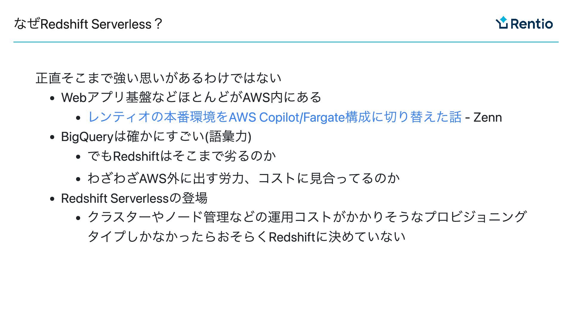 正直そこまで強い思いがあるわけではない Webアプリ基盤などほとんどがAWS内にある レンティオの本番環境をAWS Copilot/Fargate構成に切り替えた話 - Zenn BigQueryは確かにすごい(語彙力) でもRedshiftはそこまで劣るのか わざわざAWS外に出す労力、コストに見合ってるのか Redshift