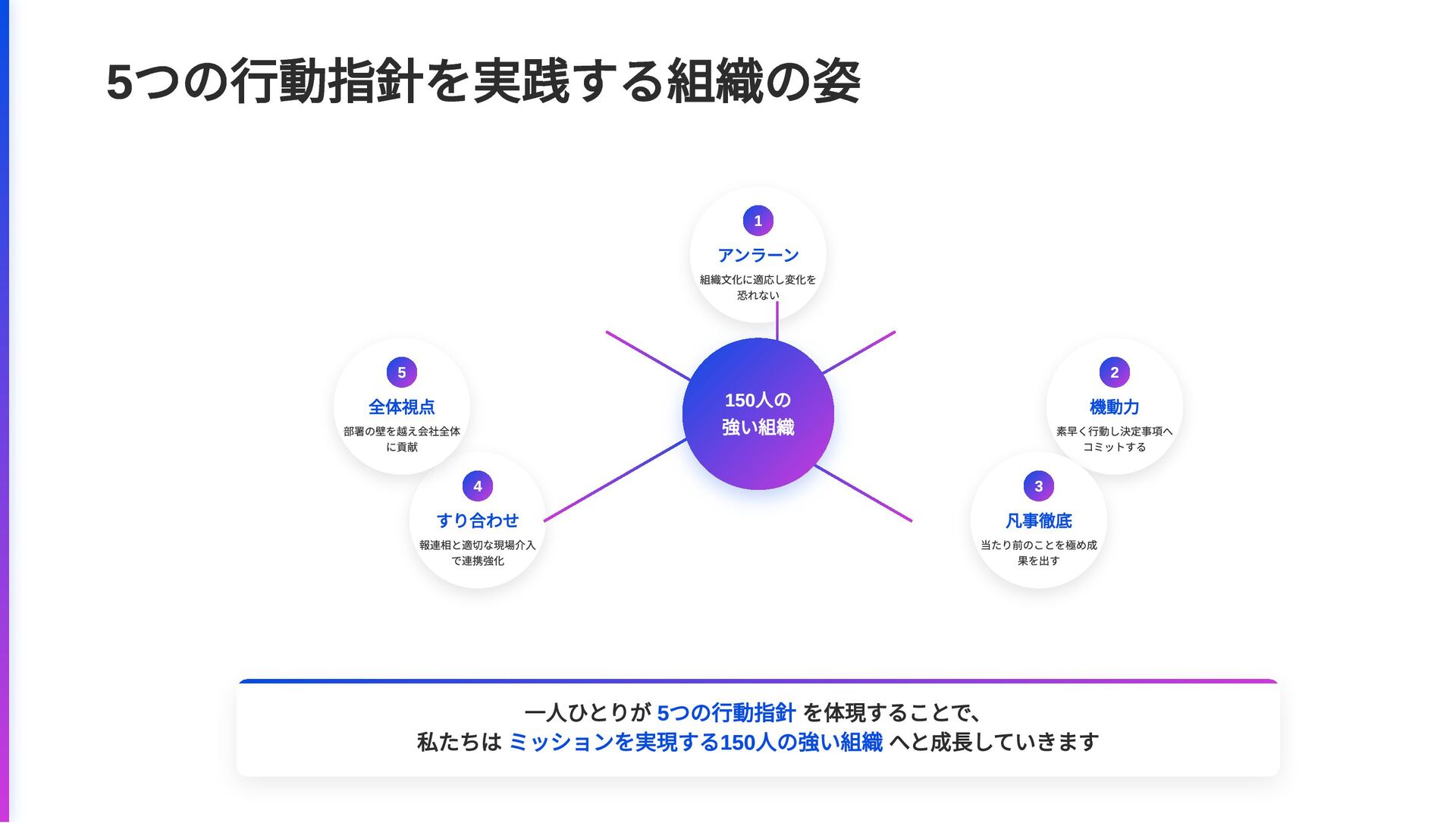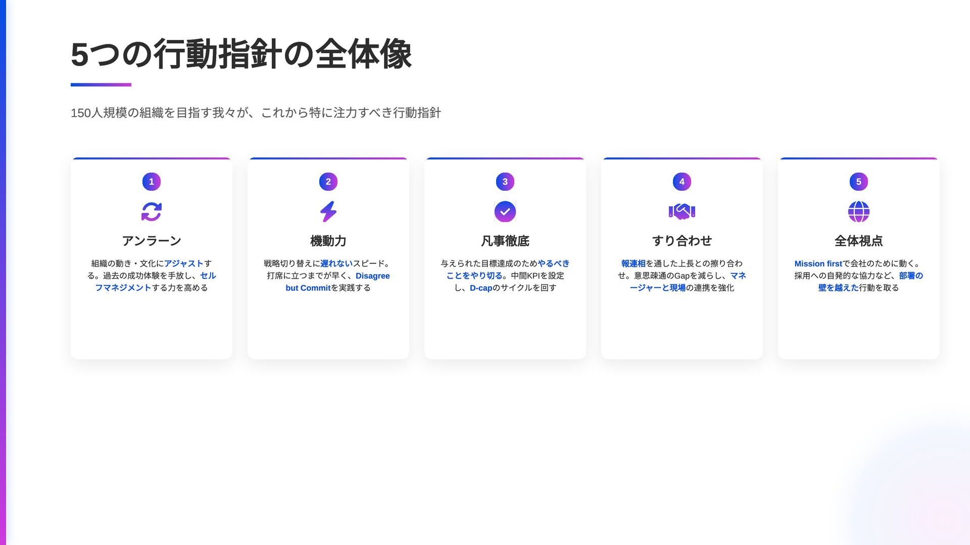 5 つの行動指針の全体像 150 人規模の組織を目指す我々が、これから特に注力すべき行動指針 1 アンラーン 組織の動き・文化にアジャストす る。過去の成功体験を手放し、セル フマネジメントする力を高める