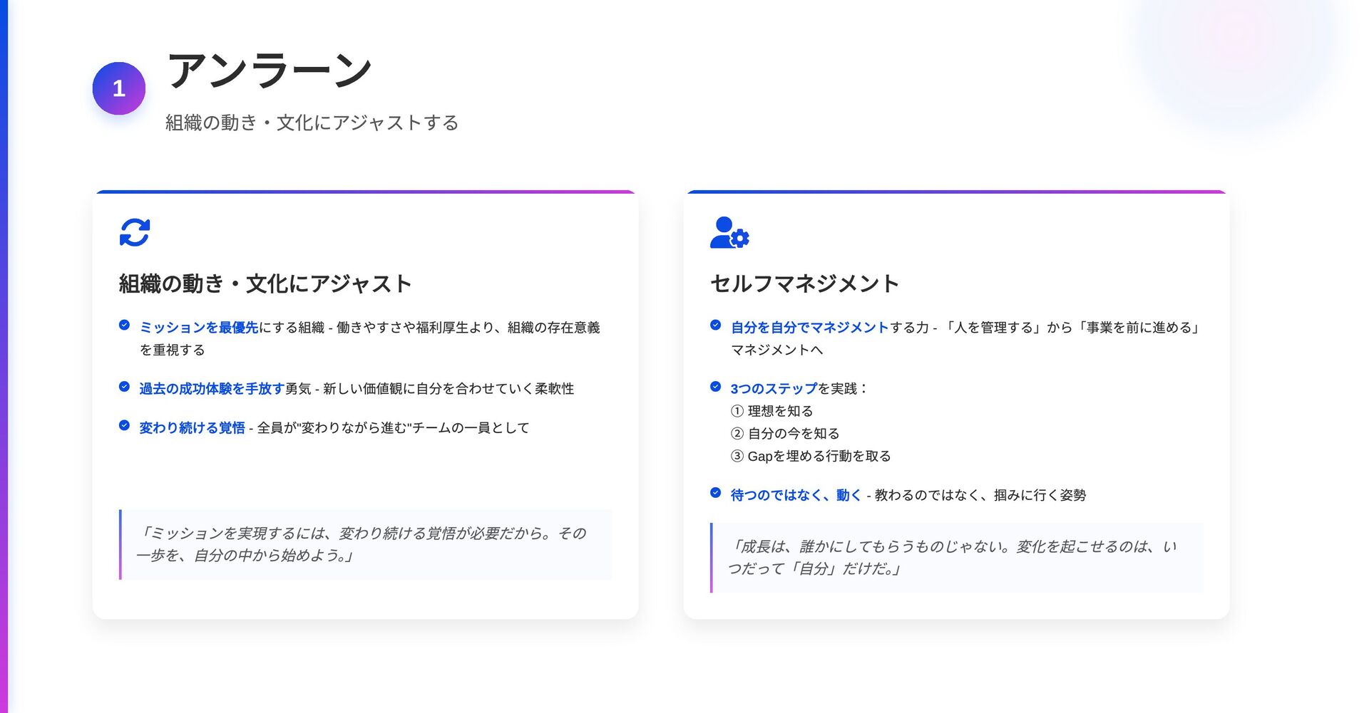 過去の成功体験を手放す勇気 - 新しい価値観に自分を合わせていく柔軟性 変わり続ける覚悟 - 全員が" 変わりながら進む" チームの一員として 「ミッションを実現するには、変わり続ける覚悟が必要だから。その 一歩を、自分の中から始めよう。 」 セルフマネジメント 自分を自分でマネジメントする力 - 「人を管理する」から「事業を前に進める」 マネジメントへ 3 つのステップを実践: ① 理想を知る ② 自分の今を知る ③ Gap を埋める行動を取る 待つのではなく、動く - 教わるのではなく、掴みに行く姿勢 「成長は、誰かにしてもらうものじゃない。変化を起こせるのは、い つだって「自分」だけだ。 」