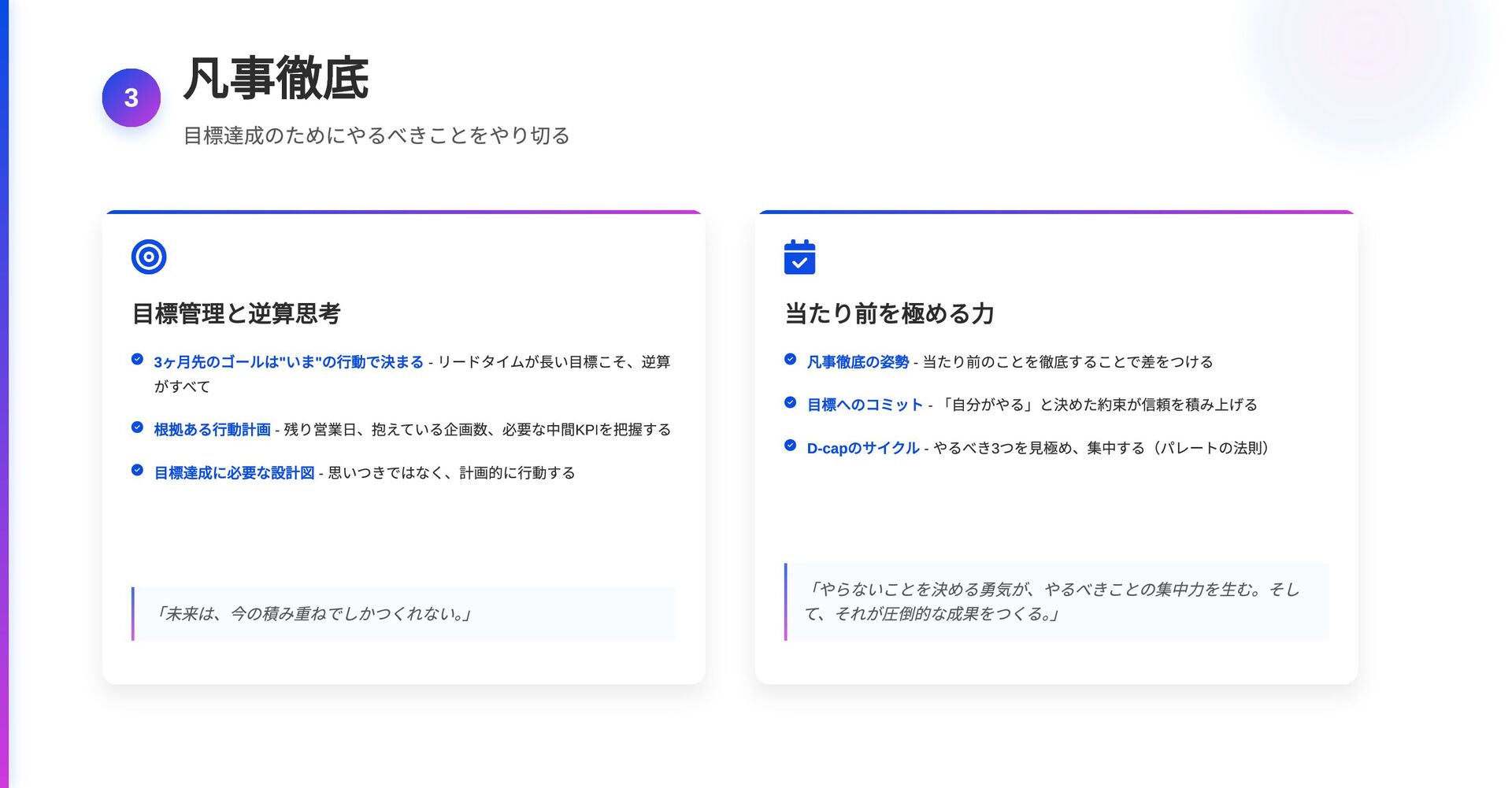 - リードタイムが長い目標こそ、逆算 がすべて 根拠ある行動計画 - 残り営業日、抱えている企画数、必要な中間KPI を把握する 目標達成に必要な設計図 - 思いつきではなく、計画的に行動する 「未来は、今の積み重ねでしかつくれない。 」 当たり前を極める力 凡事徹底の姿勢 - 当たり前のことを徹底することで差をつける 目標へのコミット - 「自分がやる」と決めた約束が信頼を積み上げる D-cap のサイクル - やるべき3 つを見極め、集中する(パレートの法則) 「やらないことを決める勇気が、やるべきことの集中力を生む。そし て、それが圧倒的な成果をつくる。 」