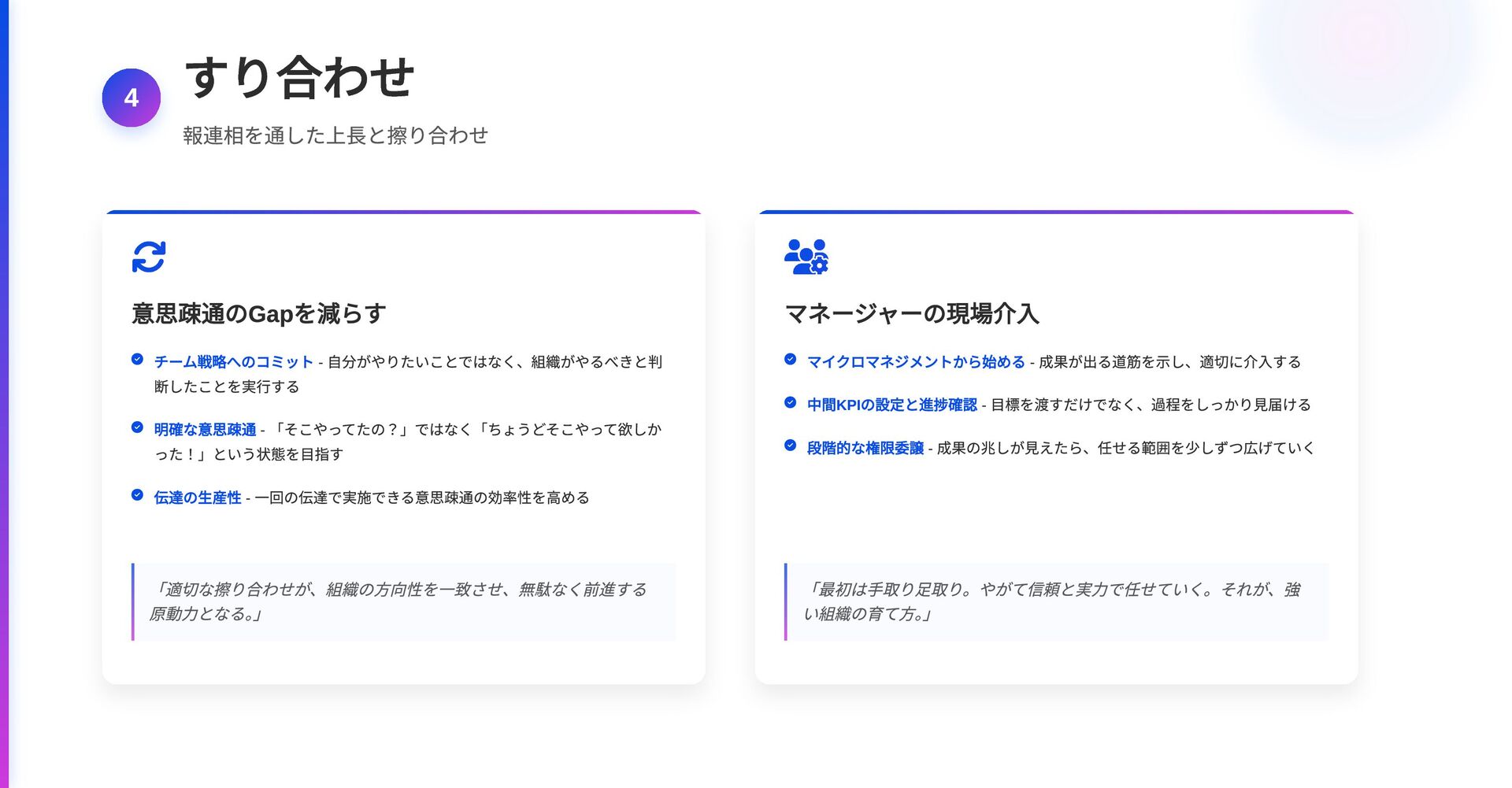 断したことを実行する 明確な意思疎通 - 「そこやってたの?」ではなく「ちょうどそこやって欲しか った!」という状態を目指す 伝達の生産性 - 一回の伝達で実施できる意思疎通の効率性を高める 「適切な擦り合わせが、組織の方向性を一致させ、無駄なく前進する 原動力となる。 」 マネージャーの現場介入 マイクロマネジメントから始める - 成果が出る道筋を示し、適切に介入する 中間KPI の設定と進捗確認 - 目標を渡すだけでなく、過程をしっかり見届ける 段階的な権限委譲 - 成果の兆しが見えたら、任せる範囲を少しずつ広げていく 「最初は手取り足取り。やがて信頼と実力で任せていく。それが、強 い組織の育て方。 」