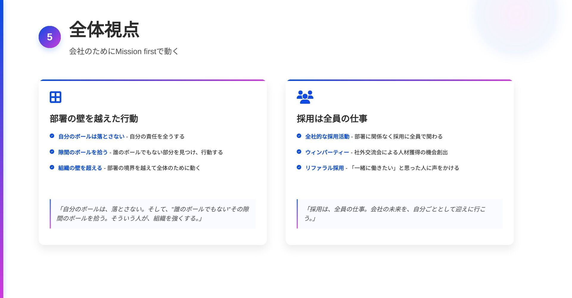 5 全体視点 会社のためにMission first で動く 部署の壁を越えた行動 自分のボールは落とさない -