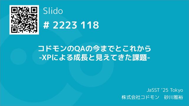 Slido # 2223 118 コドモンのQAの今までとこれから -XPによる成長と見えてきた課題- JaSST ‘25 Tokyo 株式会社コドモン 砂川雅裕