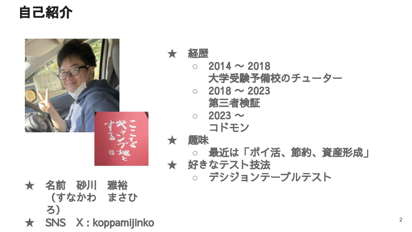 経歴 ◦ 2014 〜 2018 大学受験予備校のチューター ◦ 2018 〜 2023 第三者検証 ◦ 2023 〜 コドモン ★ 趣味 ◦ 最近は「ポイ活、節約、資産形成」 ★ 好きなテスト技法 ◦ デシジョンテーブルテスト 2