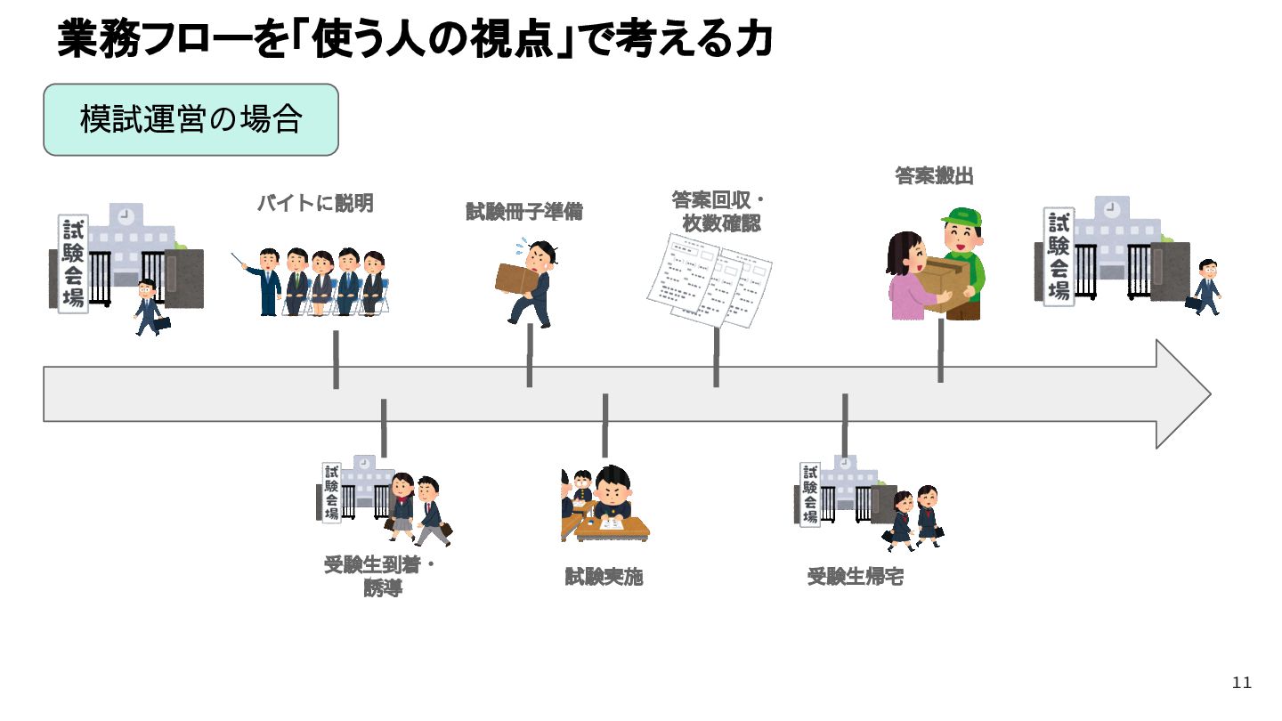 業務フローを「使う人の視点」で考える力 模試運営の場合 バイトに説明 受験生到着・ 誘導 試験実施 答案回収・ 枚数確認 試験冊子準備