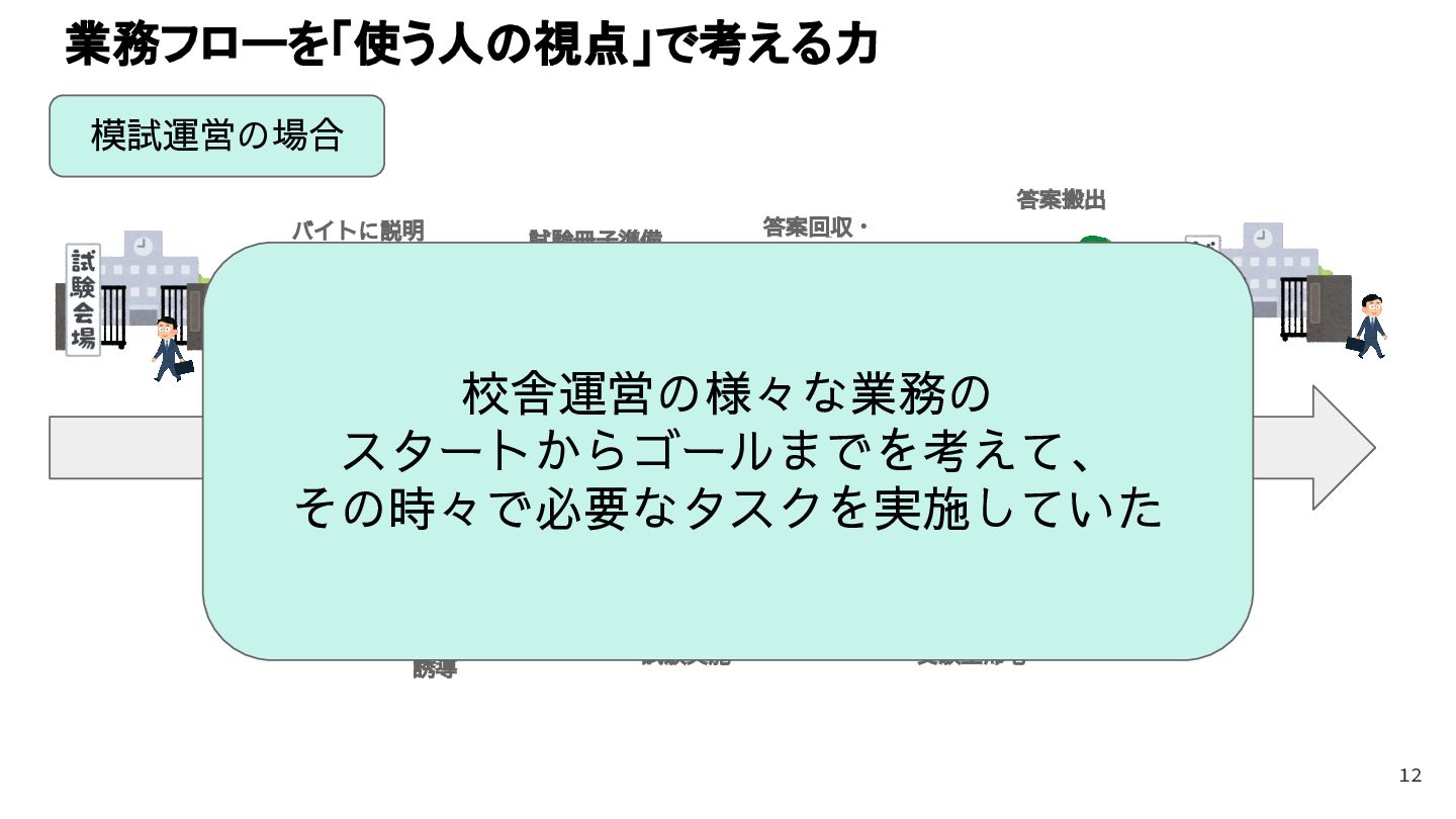 受験生帰宅 答案搬出 校舎運営の様々な業務の スタートからゴールまでを考えて、 その時々で必要なタスクを実施していた 12