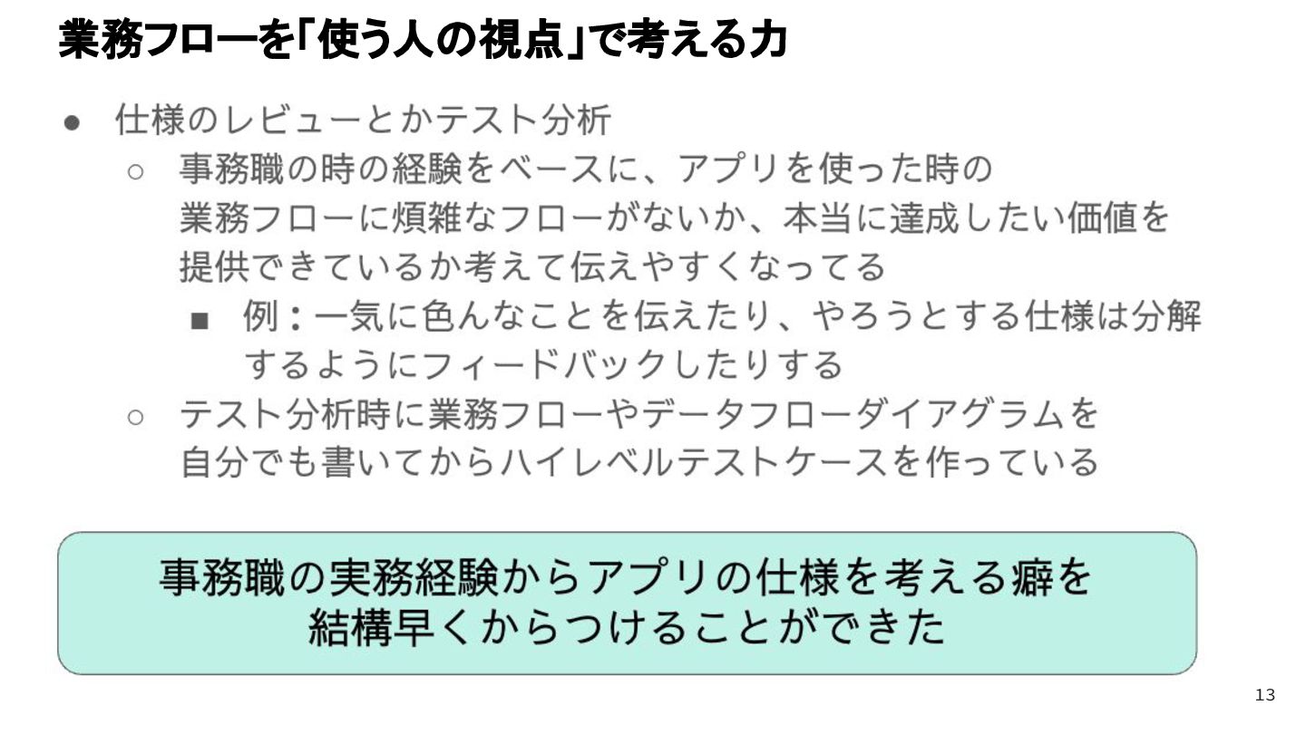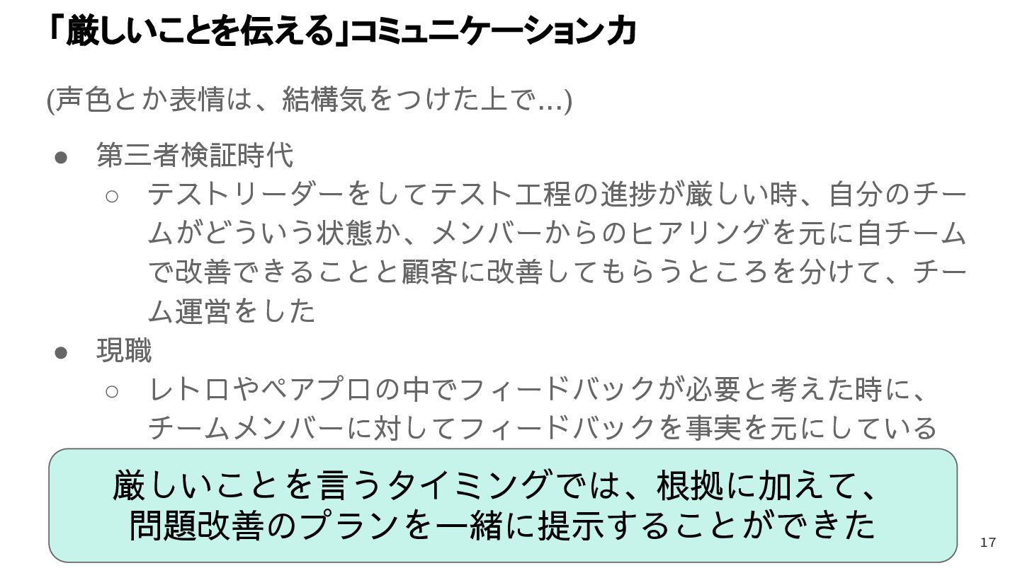 「厳しいことを伝える」コミュニケーション力 (声色とか表情は、結構気をつけた上で...) • 第三者検証時代 ◦ テストリーダーをしてテスト工程の進捗が厳しい時、自分のチー ムがどういう状態か、メンバーからのヒアリングを元に自チーム で改善できることと顧客に改善してもらうところを分けて、チー ム運営をした