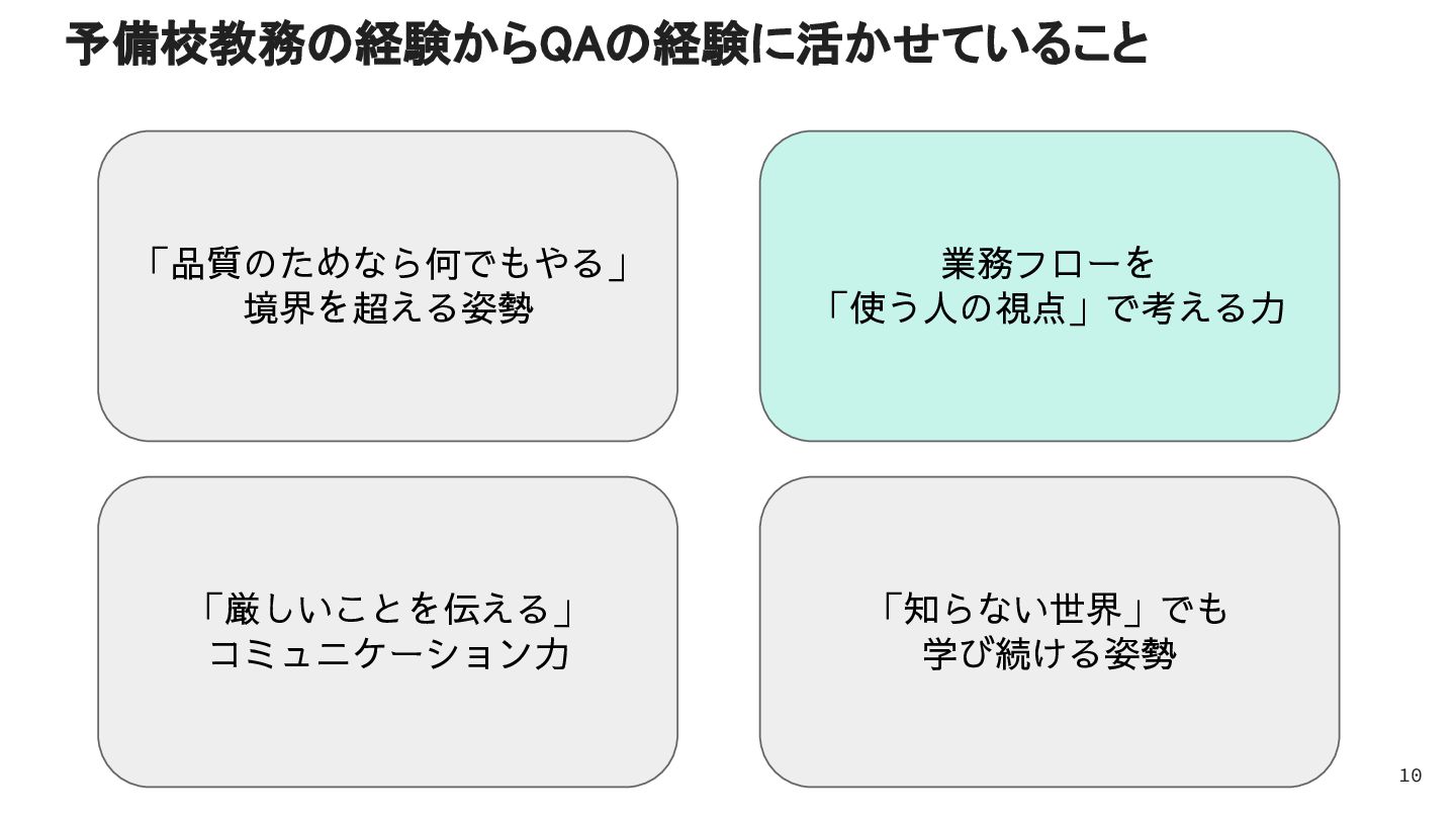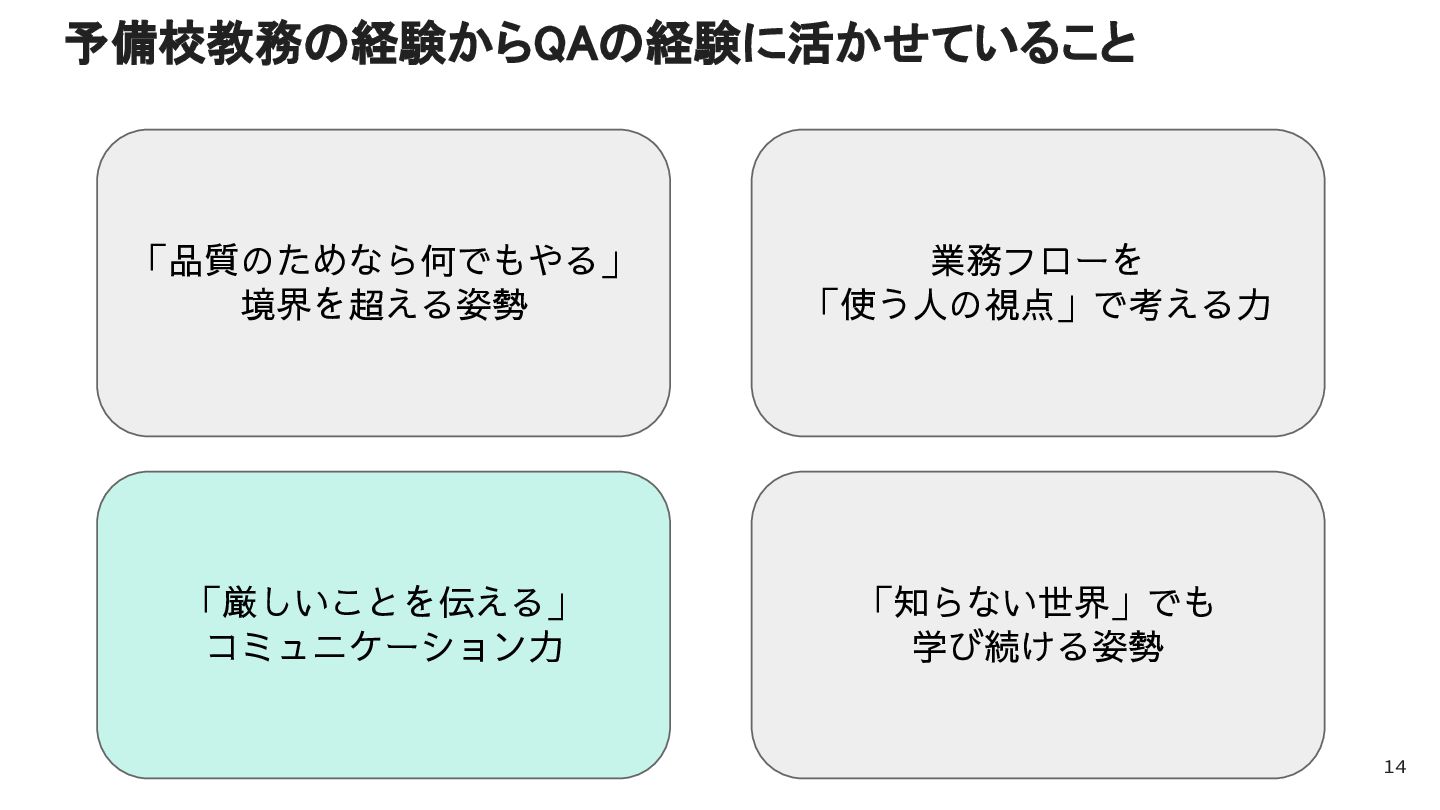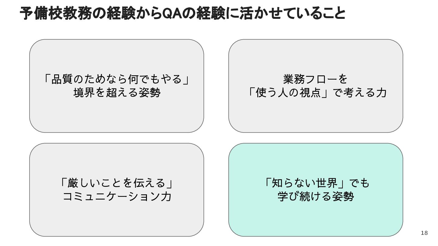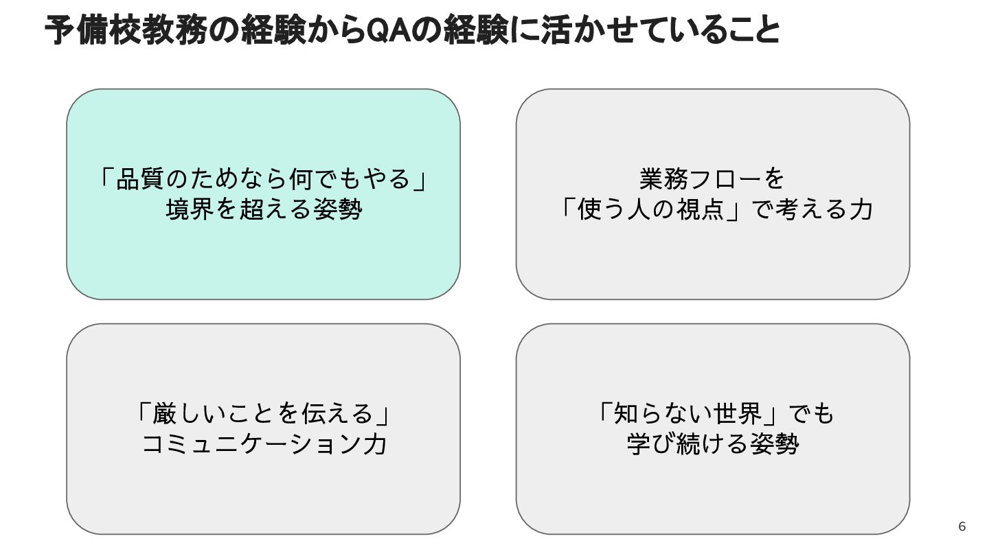 予備校教務の経験からQAの経験に活かせていること 「品質のためなら何でもやる」 境界を超える姿勢 業務フローを 「使う人の視点」で考える力 「厳しいことを伝える」 コミュニケーション力 「知らない世界」でも 学び続ける姿勢