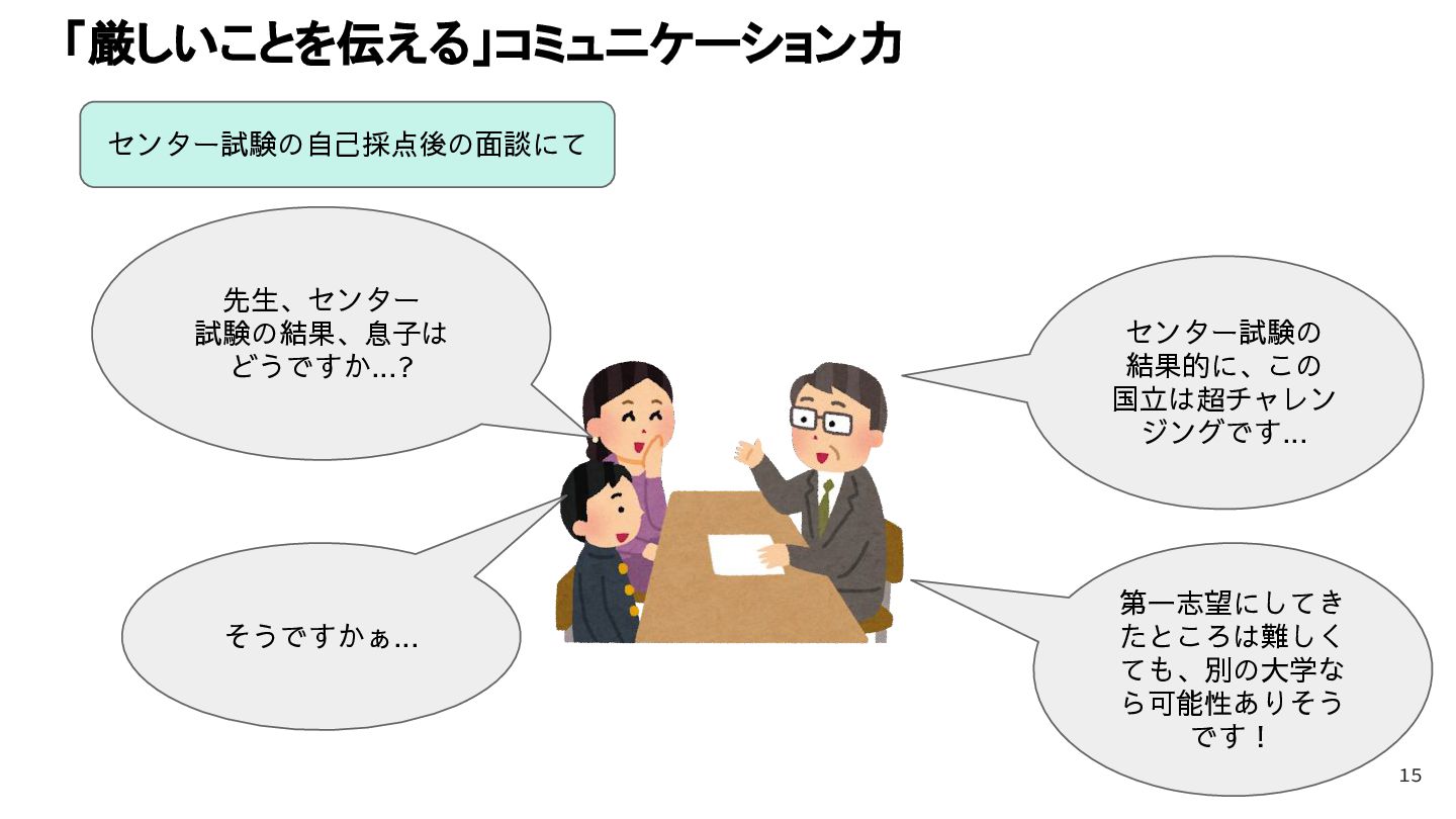 「厳しいことを伝える」コミュニケーション力 センター試験の 結果的に、この 国立は超チャレン ジングです... 先生、センター 試験の結果、息子は どうですか...? そうですかぁ...