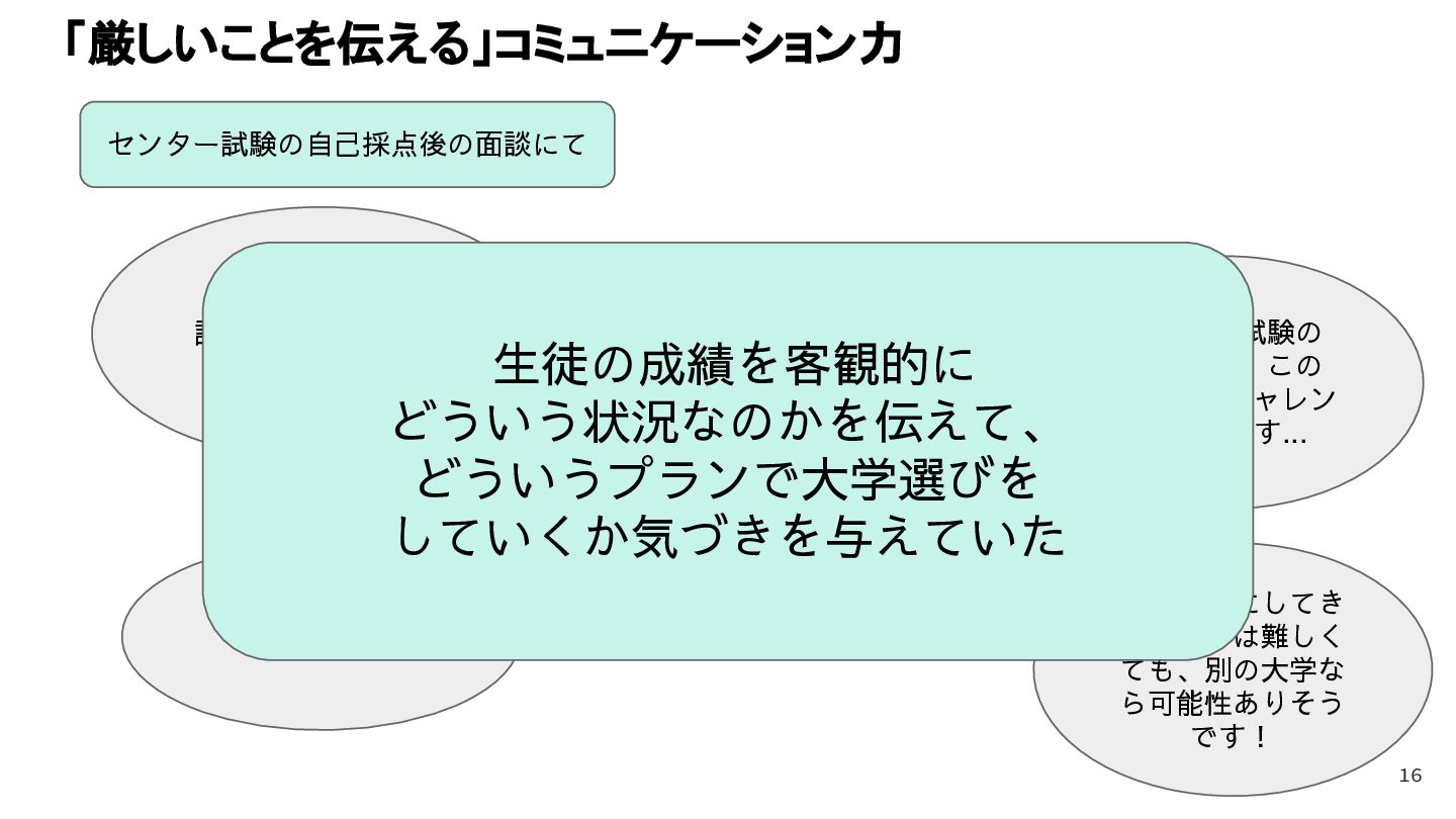 センター試験の自己採点後の面談にて 第一志望にしてき たところは難しく ても、別の大学な ら可能性ありそう です! 生徒の成績を客観的に どういう状況なのかを伝えて、 どういうプランで大学選びを していくか気づきを与えていた 16