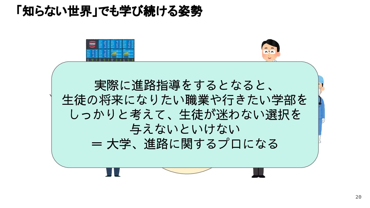「知らない世界」でも学び続ける姿勢 実際に進路指導をするとなると、 生徒の将来になりたい職業や行きたい学部を しっかりと考えて、生徒が迷わない選択を 与えないといけない = 大学、進路に関するプロになる 20