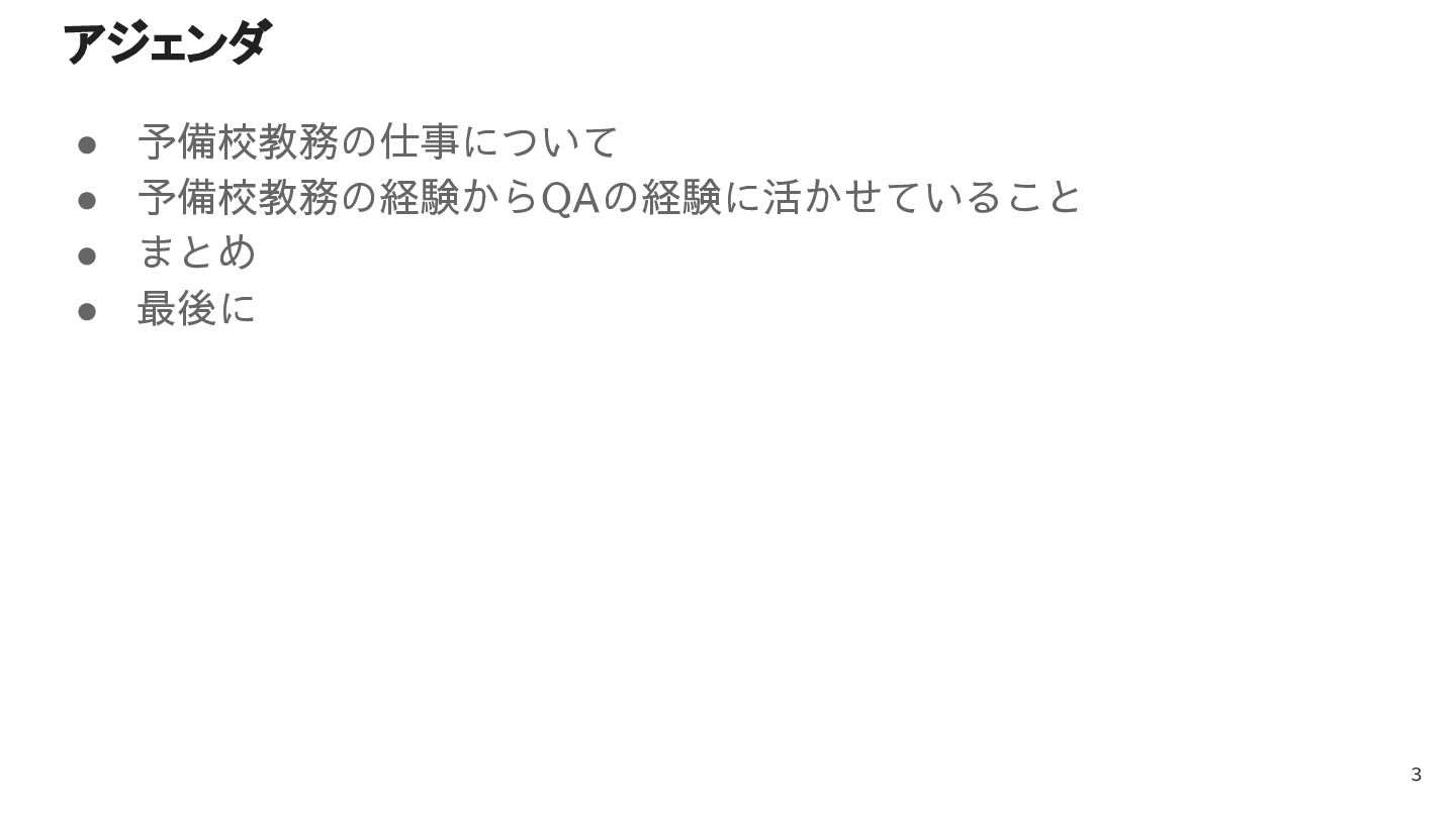 アジェンダ • 予備校教務の仕事について • 予備校教務の経験からQAの経験に活かせていること • まとめ • 最後に
