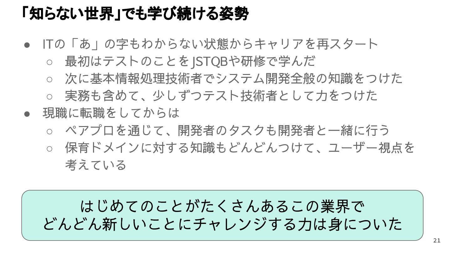 「知らない世界」でも学び続ける姿勢 • ITの「あ」の字もわからない状態からキャリアを再スタート ◦ 最初はテストのことをJSTQBや研修で学んだ ◦ 次に基本情報処理技術者でシステム開発全般の知識をつけた ◦ 実務も含めて、少しずつテスト技術者として力をつけた
